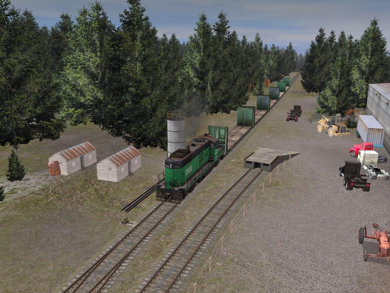 Tags: Trainz: A New Era, Legacy of the Burlington Northern v2, West Clyde Sawmill, BN GP5 low hood, BN 62Ft. Bulkhead (early era)