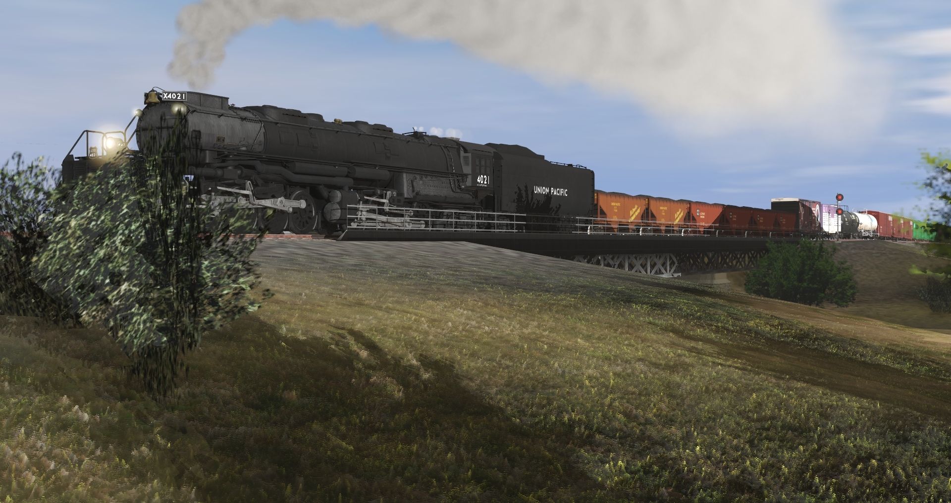 Tags: Trainz Railroad Simulator 2019, 2015 Mojave Subdivision ( Mobile) UPDATE!!!, Default, Union Pacific Big Boy Engine, EMC F9A #4213, EMC F9A #4212, Union Pacific Big Boy Tender, 2bay hopper UP Billboard, 2bay hopper A.T.S.F., 40ft Hycube NP 3195, 40ft Stockcar Canadian Pacific 274383, 48ft Tanker BNSF 880098, 48ft Tanker GATX 50078, 50ftBoxcar Norfolk Southern DP #M