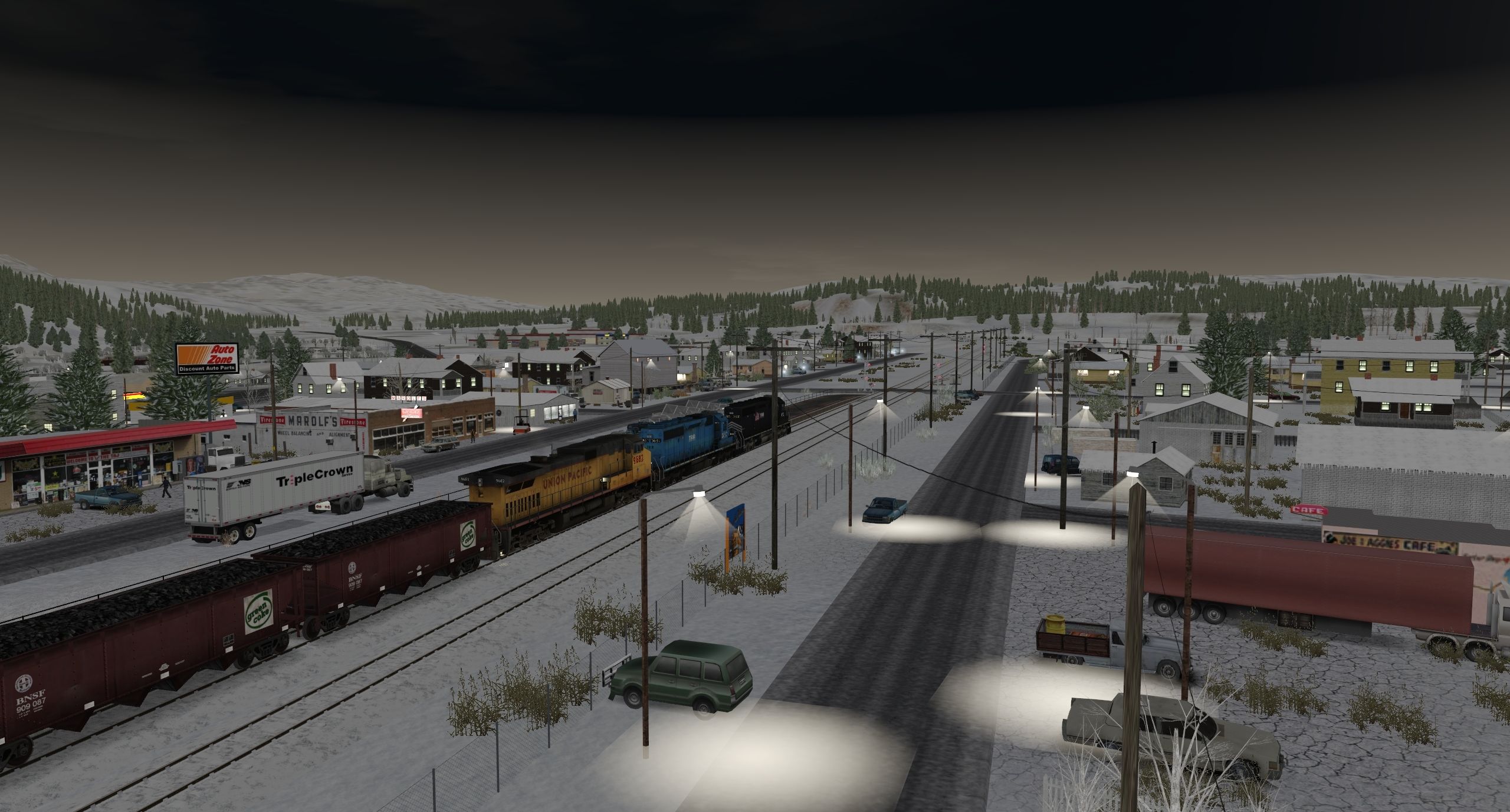 Tags: Trainz Railroad Simulator 2022, West from Denver - Moffat Route, 02 Winter Park Express - Eastbound (Evening) - 18:56 27/02/2022 - 03:17, UP Dash 9-44CW (ex-CNW), TRR SD40-2 patched, TRR SD40-2, HI BNSF green coke hopper (coal)