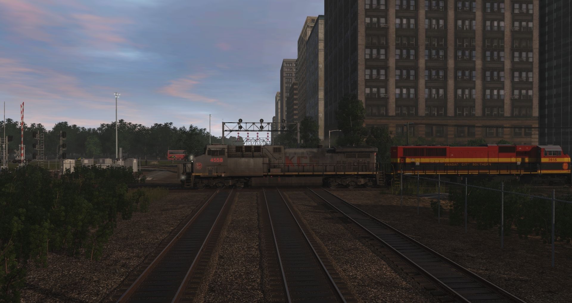 Tags: Trainz Railroad Simulator 2019, Terminal RR, Terminal RR - Default, KCSM AC4400CW 4550-4574 TS19 4, KCS Belle SD70MAC, CSX B40-8 YN2 (ex NYSW) Early, CSX B40-8 YN3B (ex NYSW), TTX 40ft Thrall Well Car A 748184, TTX 40ft Thrall Well Car B 748184, JMGX Trinity 3 Bay Hopper, JRPX CB 20800 gal tank car, JRPX 20800 gal tank car, JRPX BL 20800 gal tank car, DODX Caboose
