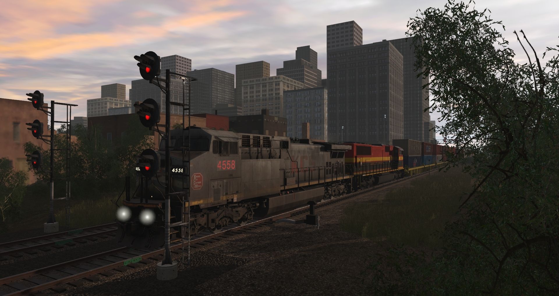 Tags: Trainz Railroad Simulator 2019, Terminal RR, Terminal RR - Default, KCSM AC4400CW 4550-4574 TS19 4, KCS Belle SD70MAC, CSX B40-8 YN2 (ex NYSW) Early, CSX B40-8 YN3B (ex NYSW), TTX 40ft Thrall Well Car A 748184, TTX 40ft Thrall Well Car B 748184, JMGX Trinity 3 Bay Hopper, JRPX CB 20800 gal tank car, JRPX 20800 gal tank car, JRPX BL 20800 gal tank car, DODX Caboose