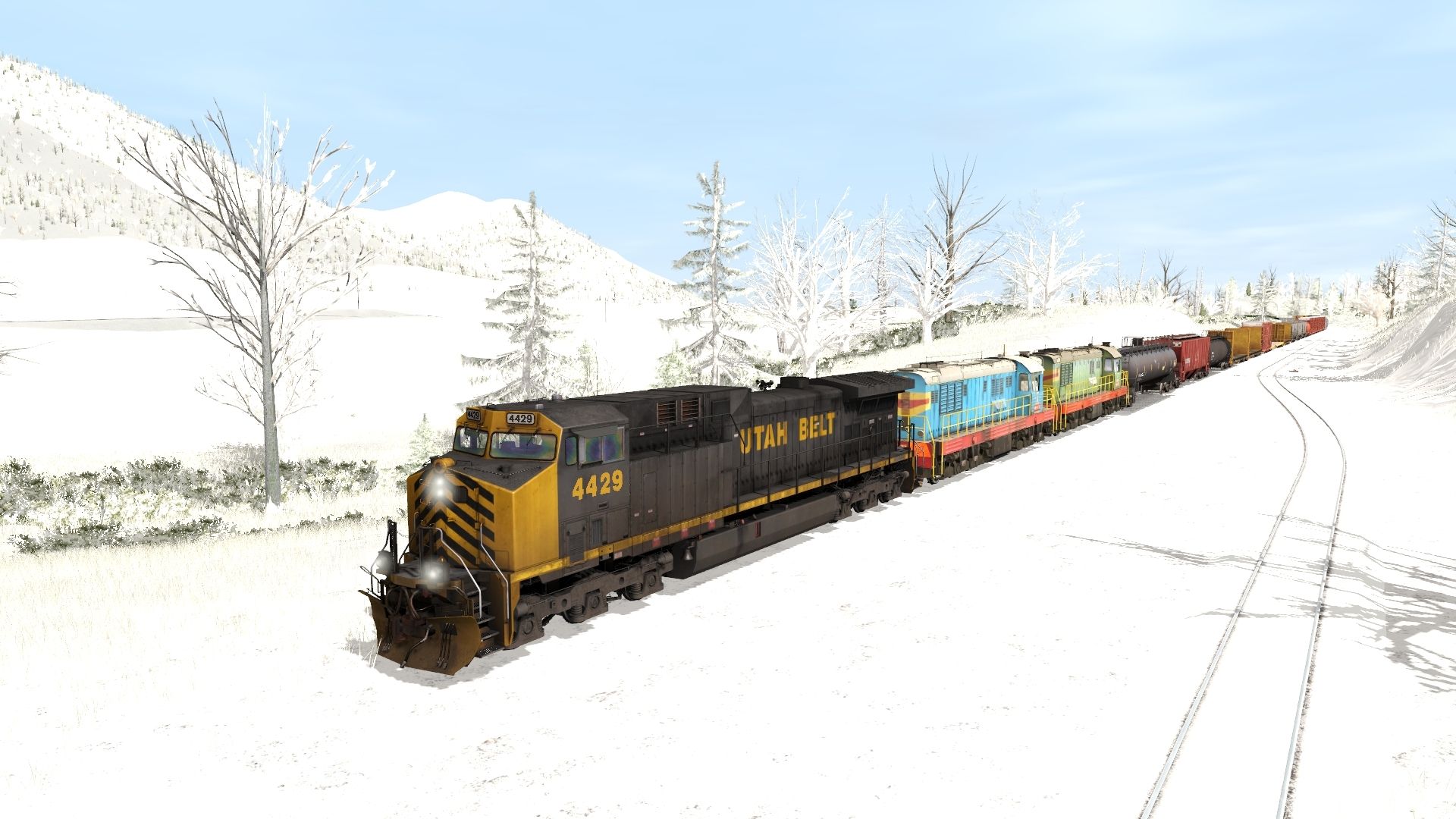 Tags: Trainz Railroad Simulator 2022, Centrella Sub Division - TRS19, Default - 18:08 04/03/2022 - 02:32, Utah Belt AC4400CW 4400-4450 TS19, CHME3-5763, CHME3-3172, TILX 33585 Gal Tank Car weathered 2, VFGX Trinity 3 Bay Hopper, TankTrain B, JR 52ft Bulkhead HMGX, JR 50ft Boxcar AOK #2, 89ft Flatcar ITTX #911522, NGCX Trinity 3 Bay Hopper, WTXX Cylindrical Hopper
