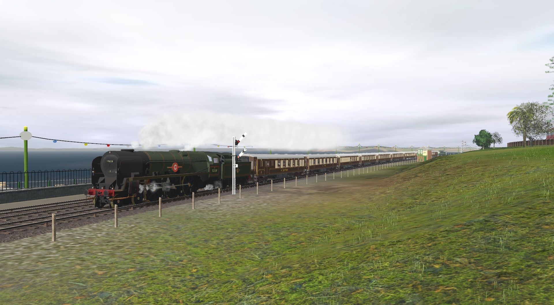Tags: Trainz Railroad Simulator 2019, ADL Railroad 5 SOUTHv1 016, ADL Railroad 5 SOUTHv1 016 - Default, RB Merchant Navy, BR Class 33_0 Green (no yellow), RB Merchant Navy 6000 Gal Late Logo Tender, Pullman K Brake Third, Pullman K Parlour First, Pullman 1951 Bar, Pullman 1951 Parlour First, Pullman 6PUL Kitchen Composite, Pullman 5BEL Kitchen First, BR 13T Steel Open Diag 1/019, BR 12T Fitted Van