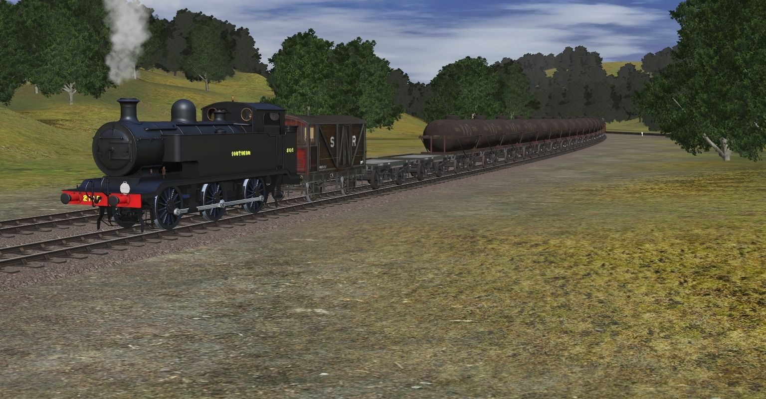 Tags: Trainz Railroad Simulator 2019, Dearnby & Region V3: UK 1950's - 60's v1 449L, LBSCR E2 Bulleid Black Long Tanks, WD Austerity 2-8-0, WD 2-10-0 (Green), USATC S100 class 0-6-0T, 3DZ USATC S160 Class, USA tank, Southern Railway Class E1R 0-6-2T V3 (Post-1941) TS2012, [SR] 10T Brake Van, WD conflat detailed, War Dept (Naval Store) 18 foot Tanker Early detailed - weathered, War Dept (Fuel Oil) 18 foot Tanker Early detailed - weathered