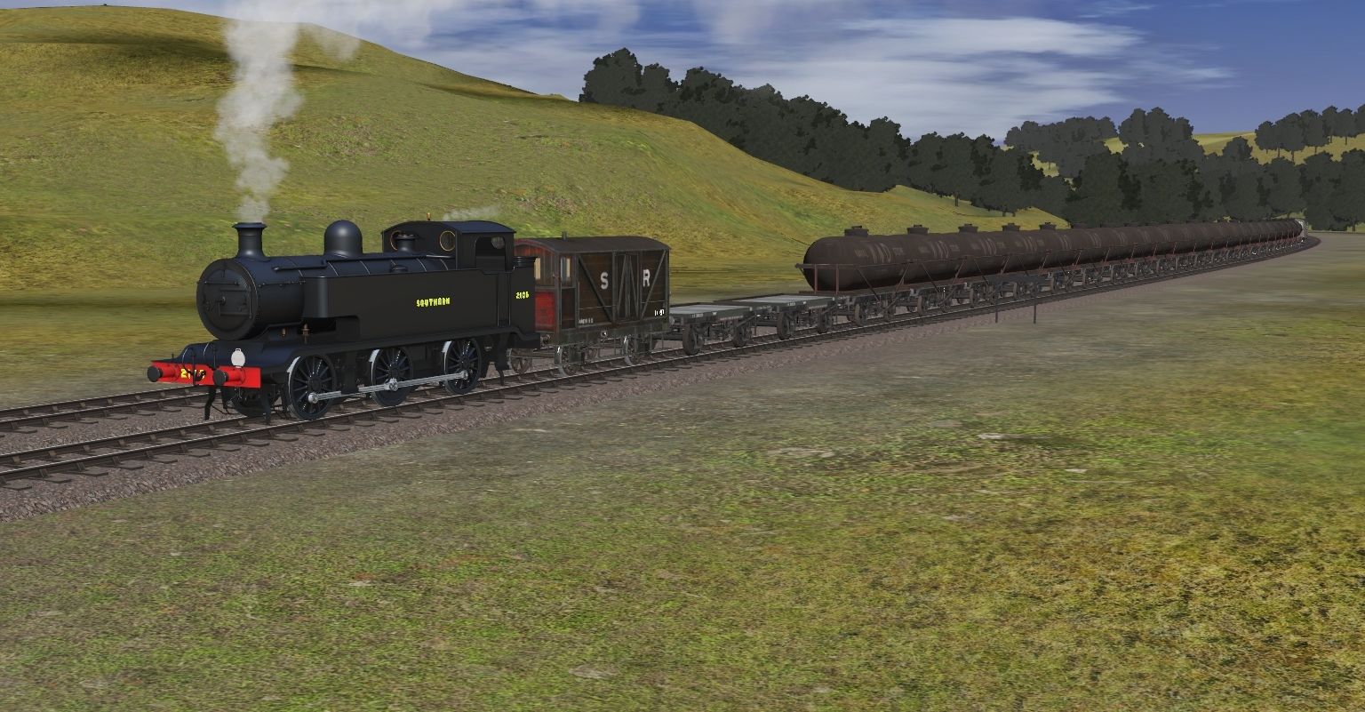 Tags: Trainz Railroad Simulator 2019, Dearnby & Region V3: UK 1950's - 60's v1 449L, LBSCR E2 Bulleid Black Long Tanks, WD Austerity 2-8-0, WD 2-10-0 (Green), USATC S100 class 0-6-0T, 3DZ USATC S160 Class, USA tank, Southern Railway Class E1R 0-6-2T V3 (Post-1941) TS2012, WD Hudson shunter, [SR] 10T Brake Van, WD conflat detailed, War Dept (Naval Store) 18 foot Tanker Early detailed - weathered