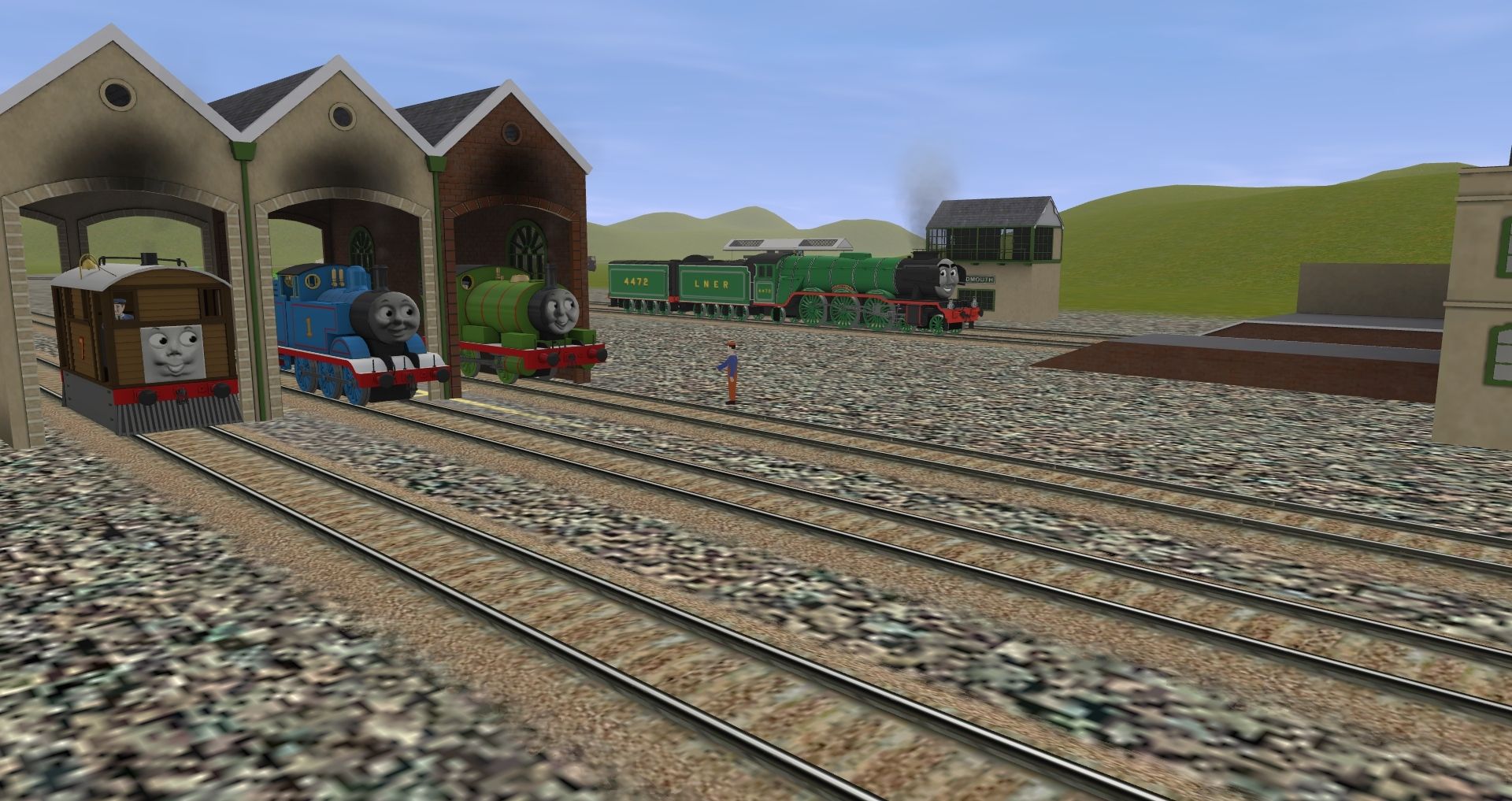 Tags: Trainz: A New Era, The Sodor Railway, Default, TTTE - Toby The Tram Engine 2010, TTTE - Thomas the Tank Engine 2010, TTTE - Percy The Small Engine 2010, Flying Scotsman (CGI), Annie The Coach 2012, Henrietta 2010, Clarabel The Coach 2012, Flying Scotsman's Coal Tender, Flying Scotsman's Water Tender, Troublesome Truck - Grey (Small Face), Sodor Brake Van Type 1a
