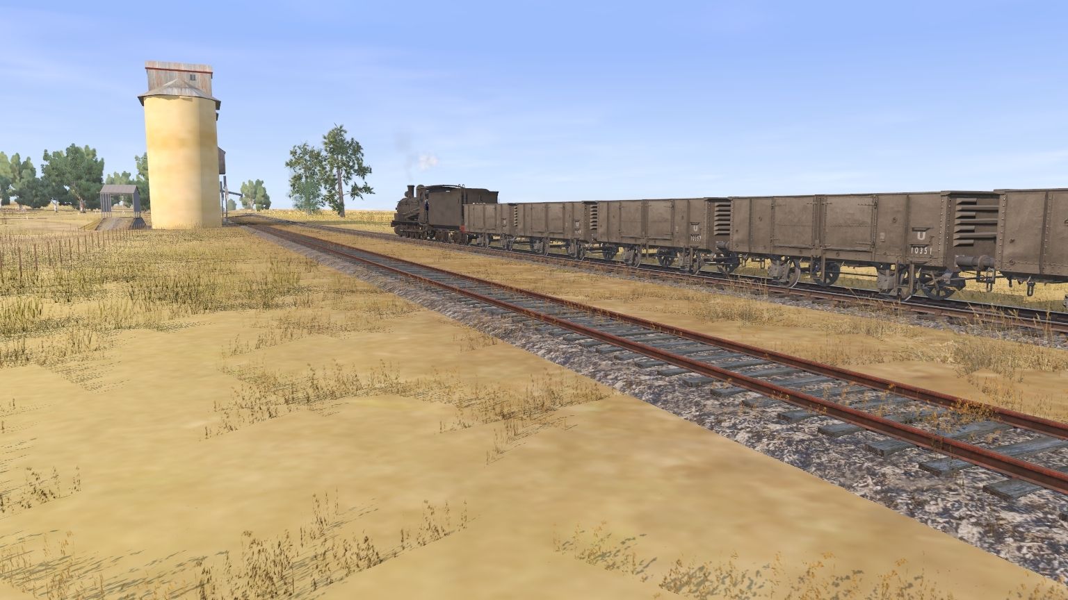 Tags: Trainz Railroad Simulator 2019, WeddinNSW: South lines to the Lachlan v 2, Default - 16:39 08/02/2022 - 02:48, NSWGR D53 standard goods engine weathered, NSWGR U 4-wheel open wagon hook couplers, NSWGR D53-class Wampu tender weathered, NSWGR RU 4-wheel wheat wagon auto-couplers dirty, NSWGR bogie fuel tanker 9000g 1929 SHELL, NSWGR TRC Refrigerated Van 1955, NSWGR IHG Brake Van