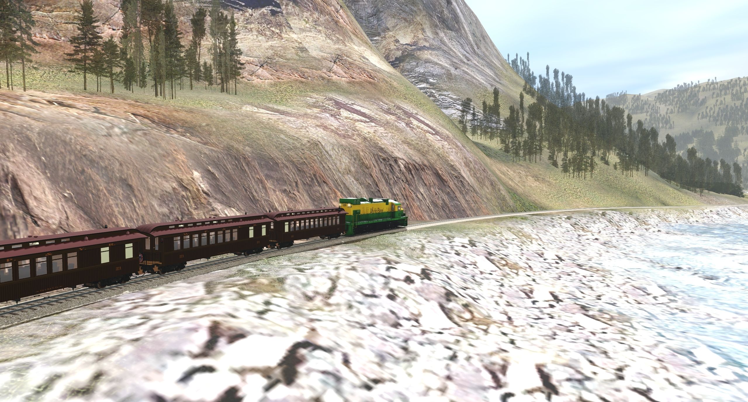 Tags: Trainz Railroad Simulator 2022, Animas Canyon, Default, WP&Y DL535E, WPY passenger car, WPY parlor 374 (afer 1924), WPY coach 222 (afer 1924), WPY baggage 201 (after 1924)