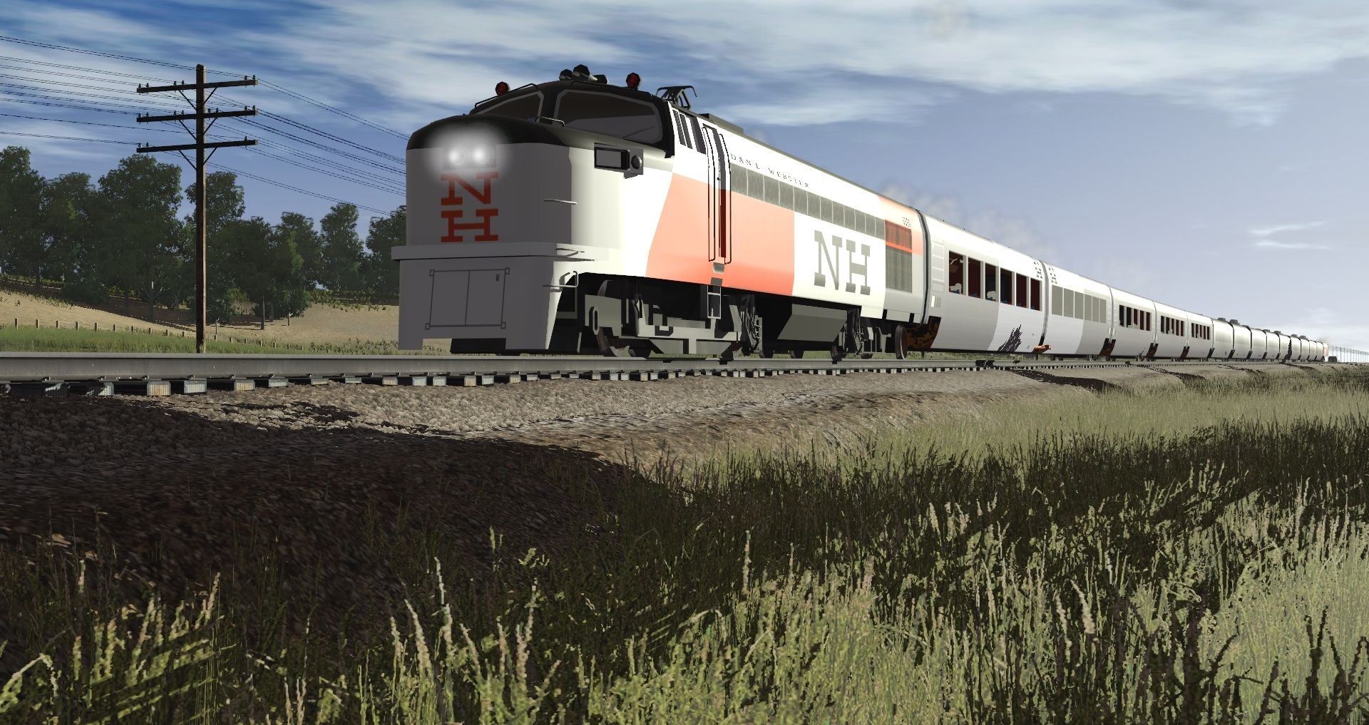 Tags: Trainz Railroad Simulator 2019, Rural Midwestern Scene (TRS19), Default, NH 3000 Dan'l Webster Locomotive Updated, NH 3000 Dan'l Webster Locomotive, Invisible loco, NH 3000 Dan'l Webster Coach R, NH 3000 Dan'l Webster Coach L, NH 3000 Dan'l Webster Coach C