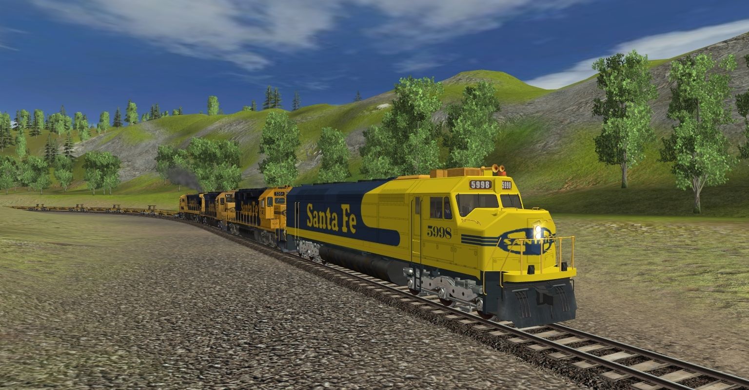 Tags: Trainz: A New Era, Kickstarter County, SF-FP45-YB-001, EMD SD40-2 ATSF 5028-5108 v1, ATSF SD45, ATSF C30-7, 89ft FlatCar Train Trailer