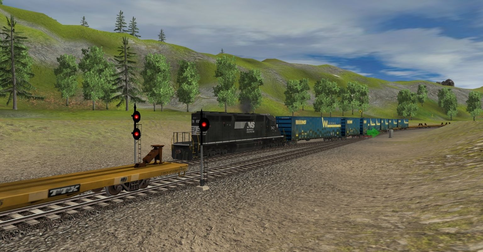 Tags: Trainz: A New Era, Kickstarter County, EMD SD40-2 NS (Ex-CR), CSX ES44AH YN3, Woodchip Norfolk Southern 196858 ant, TTX Patched 89ft TOFC Flatcar