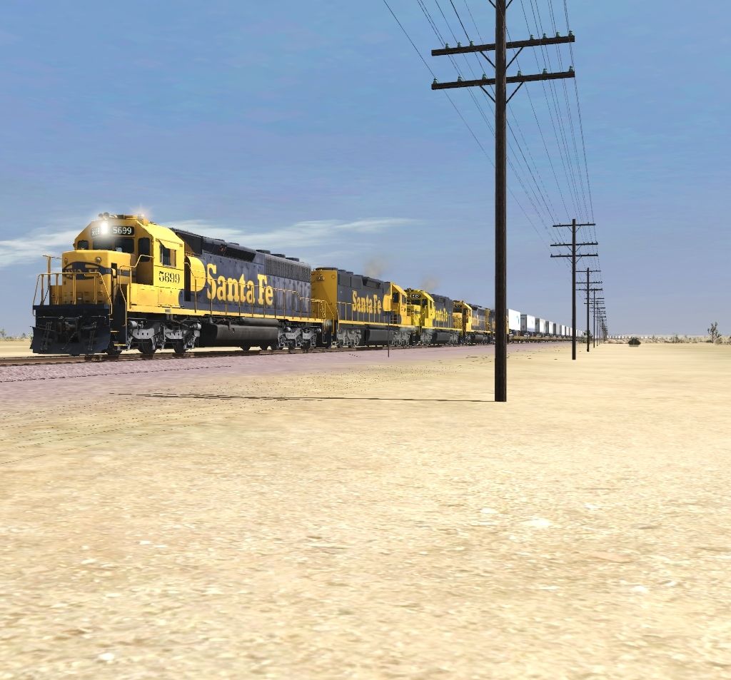 Tags: Trainz Railroad Simulator 2019, Mojave Sub Division, ATSF SD45-2 blue/yellow warbonnet, EMD SD40-2 ATSF 5020-5027 snoot v1, EMD SD40-2 ATSF 5020-5027 Snoot V2, ATSF SD45, 89ft TOFC Flatcar TTX