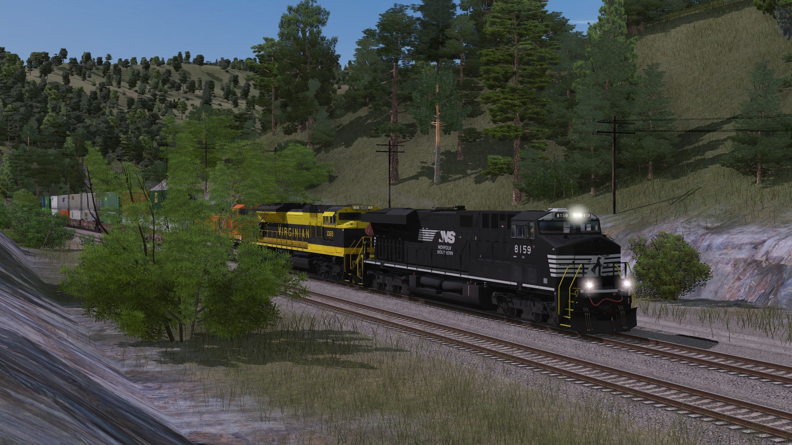 Tags: Trainz Railroad Simulator 2022, Cascade Pass II, Default, NS ES44AC, NS SD70ACe VGN Heritage 1069, BNSF C44-9W h2 5000s, GE B40-8 BNSF Heritage I UPDATE, BNSF 53 Maxi-IV A (weathered), BNSF 53 Maxi-IV C (weathered), BNSF 53 Maxi-IV B (weathered), 53ft DTTX Wellcar Weathered (Single), 53ft DTTX Wellcar (Single), 52ft Gondola BNSF Swoosh, 52ft Gondola BNSF 1