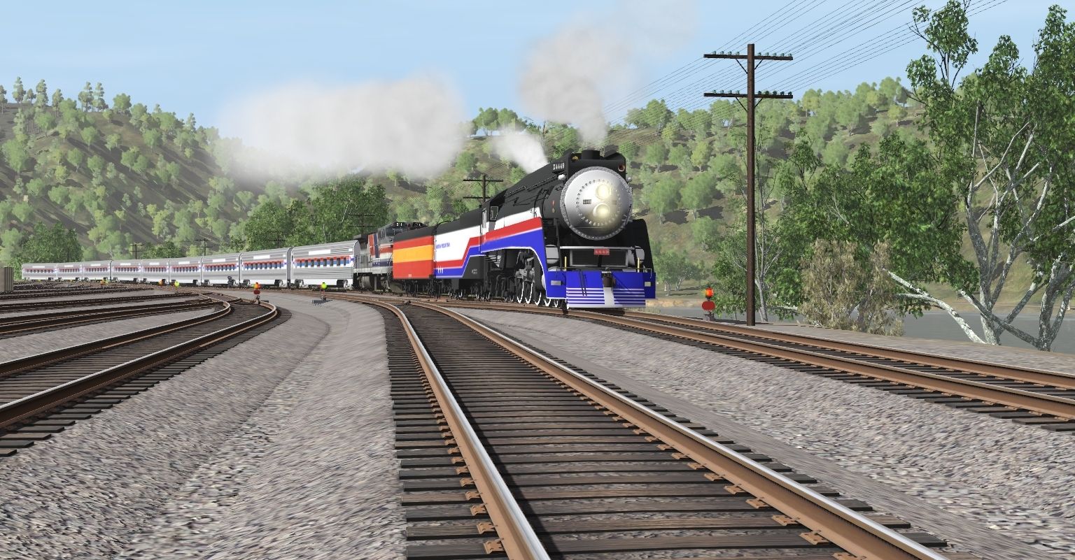 Tags: Trainz Railroad Simulator 2019, C&O Hinton Division, SP GS-4 #4449 1976 AFT Engine, Amtrak P32-8BWH Ph III, SP GS-4 #4449 1976 AFT Tender, SP GS-4 #4449 Daylight Auxillary Tender, Amtrak Coach Ex ATSF Phase I