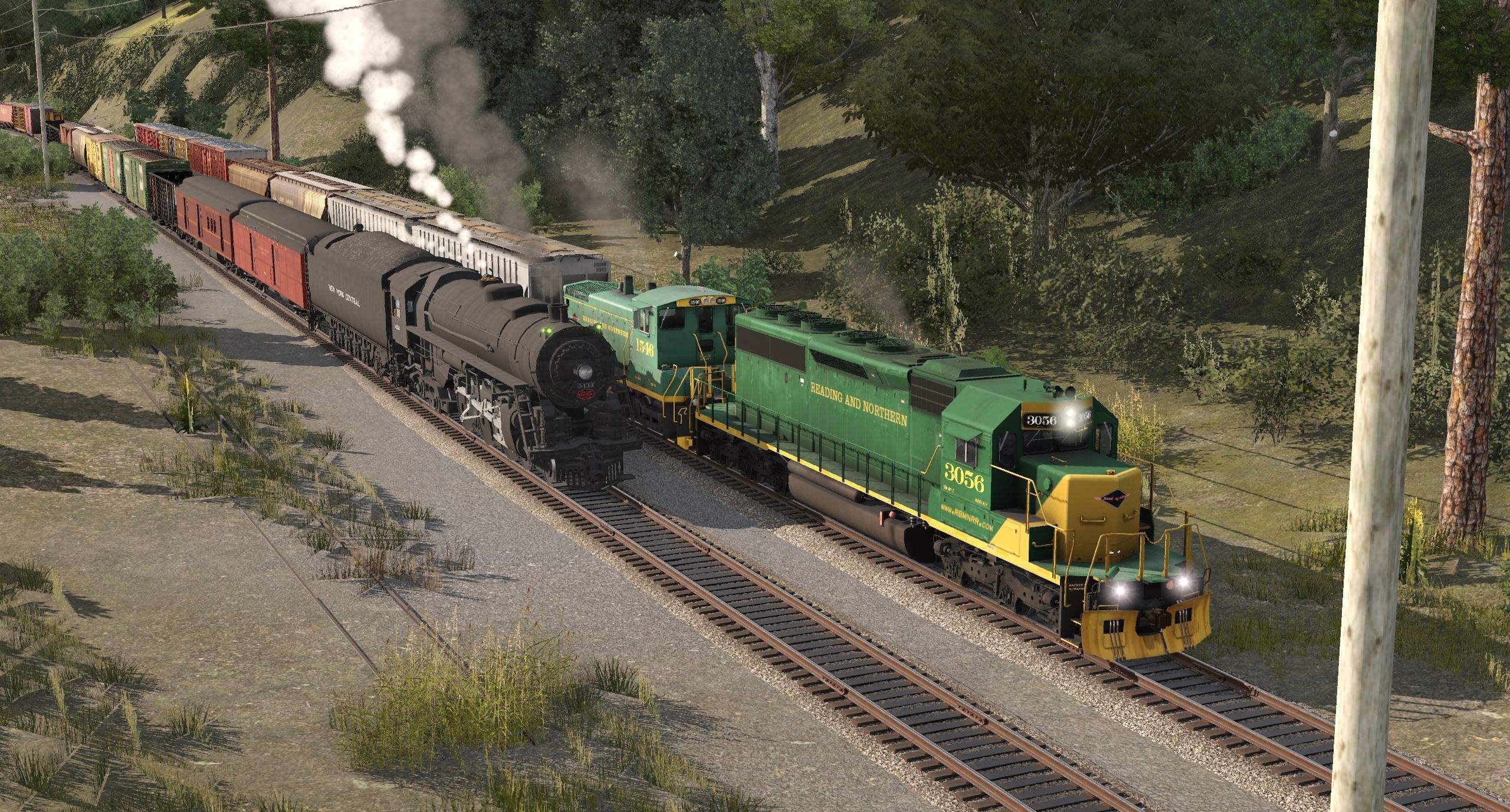 Tags: Trainz Railroad Simulator 2019, READING & NORTHERN TRS19 (pre-2020), RBMN SD40-2, NYC J3 Hudson 5433 TEST 2, RBMN SW1500 #1546, NYC Niagara Tender, RBMN Trinity 3 Bay Hopper #9989, PRR Baggage B60 1939 REA, RBMN Trinity 3 Bay Hopper #9992, ACE 3000 614T Tool Car, CPWX Centerflow Hopper #602144, CSXT ex Chessie ACF Centerflow 3 Bay long hatch, CP 100 Ton Hopper