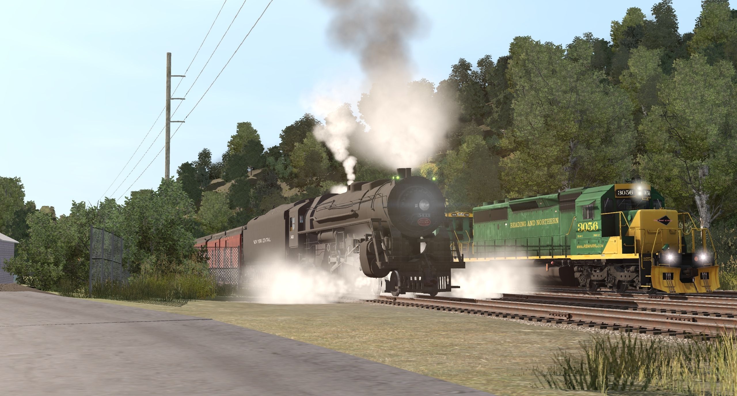Tags: Trainz Railroad Simulator 2019, READING & NORTHERN TRS19 (pre-2020), NYC J3 Hudson 5433 TEST 2, RBMN SD40-2, RBMN SW1500 #1546, NYC Niagara Tender, PRR Baggage B60 1939 REA, RBMN Trinity 3 Bay Hopper #9989, ACE 3000 614T Tool Car, RBMN Trinity 3 Bay Hopper #9992, CP 100 Ton Hopper, CSXT ex Chessie ACF Centerflow 3 Bay long hatch, BN 50' ACF Boxcar 4