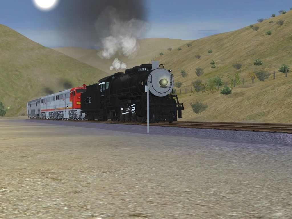Tags: Trainz: A New Era, Mojave Sub Division, ATSF 4000 Class 2-8-2 Locomotive (Mid-Late 1930's), ATSF ALCo PA-1, ATSF ALCo PB-1, ATSF 12000 Gal Tender (Aluminum Numerals), ATSF SS Baggage Car (Skirting), ATSF SS Baggage-Dorm, ATSF SS Chair Car, ATSF SS Big Dome Lounge Car, ATSF SS Lunch-Counter-Diner Car, ATSF SS Obs-Coach
