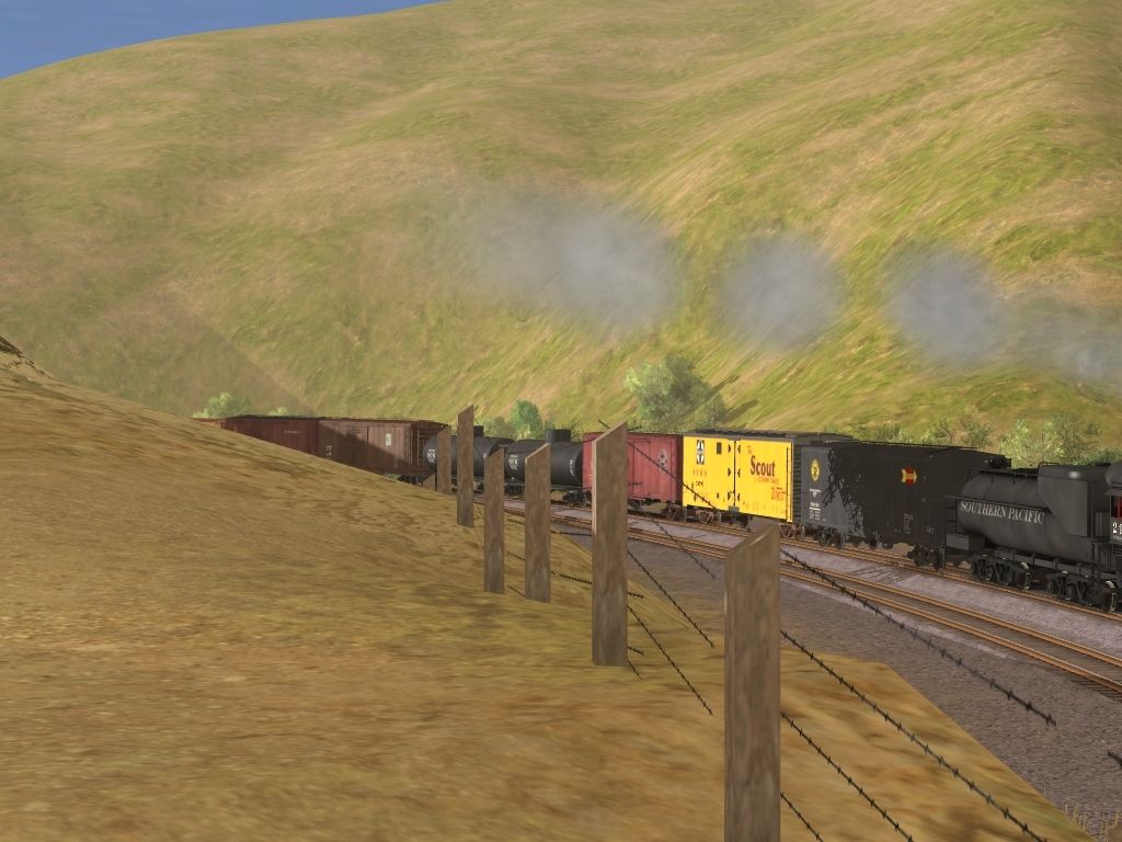 Tags: Trainz: A New Era, Mojave Sub Division, Southern Pacific Class P-10 4-6-2 - As Built, SP C40-4 Caboose - early version ver. 1, Southern Pacific P-10 Tender, 40ft SP 'Overnight' AAR Boxcar #98044, 40ft Reefer Santa Fe Scout #d, 40ft Boxcar SP B-50-20, 38' X-3 Tank Car SHPX, 50' Boxcar GTW Late (end doors), 50' Boxcar LE&E Early (end doors), 40ft Wood Reefer WP 2, 41FT Gondola B&LE