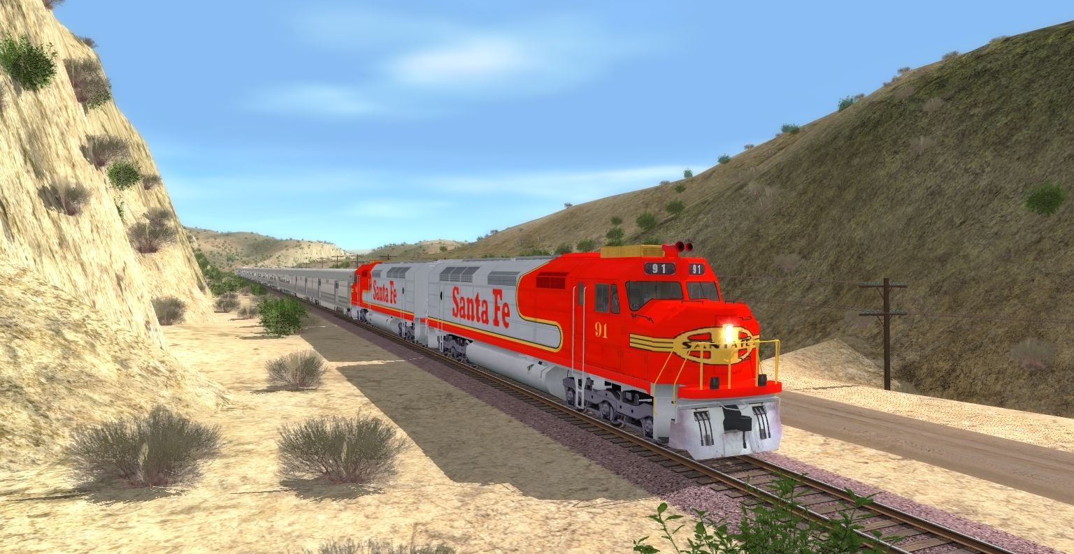 Tags: Trainz: A New Era, Cajon Subdivision - 1990 Part 1: The Pass, SF-FP45-001, ATSF Budd Baggage car, ATSF Budd Coach, ATSF Bud Dining Car, ATSF Bud Lounge Car, ATSF Bud Sleeping Car, ATSF Pleasure Dome