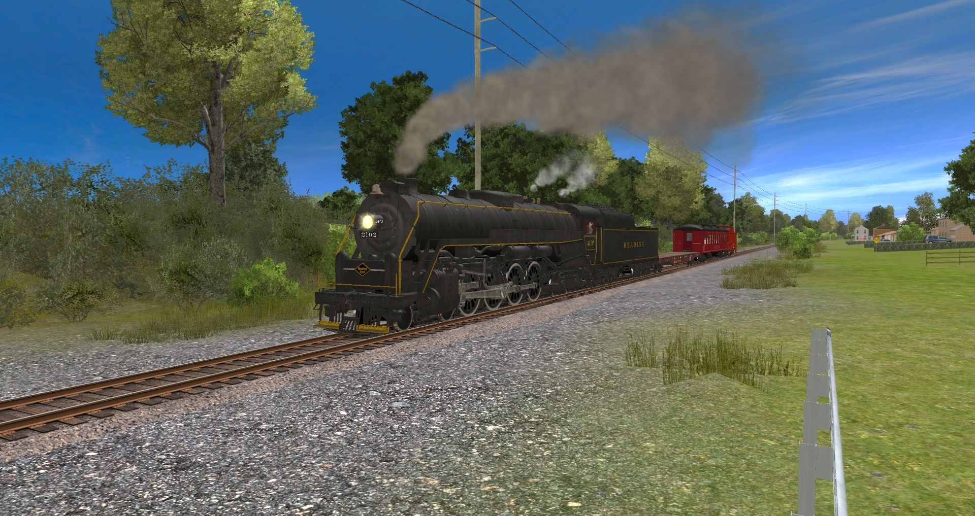 Tags: Trainz: A New Era, READING & NORTHERN TANE (post-2020), Reading T1 Rambles Engine, Reading T1 Rambles Tender, Flatcar BNSF 60ft #917504 TS12, R&N Open Air Red, RDG NMn Caboose V2, Invisible Train