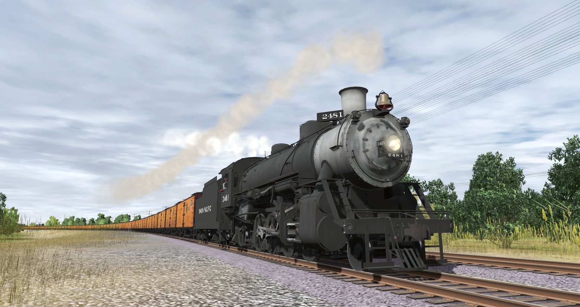 Tags: Trainz Railroad Simulator 2019, Fall Harvest - Nebraska, Default, UP MK-Spl Mikado Engine, UP MK-Spl Mikado Tender, PFE R-40-2 Reefer Early, PFE R-40-2 Reefer Late, UP Ce-11 Caboose