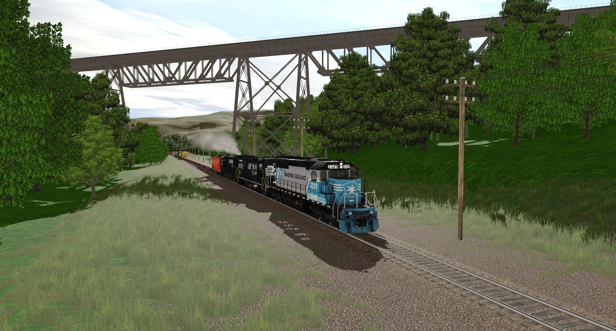 Tags: Trainz Railroad Simulator 2022, Arkansas and Missouri Railway, Default - 18:59 04/04/2022 - 01:07:43, NS Maersk SD40-2 2a1, NS GP38-2, NS C30-7, WTXX Cylindrical Hopper, BNSF Flat car 917504, HP_50ft_Boxcar_TTX_#08, HP_50ft_Boxcar_BNSF_#07, ACTX CB 20800 gal tank car, JR 50ft Boxcar CHAT #1, Bethgon JRLX, Bethgon TGNX