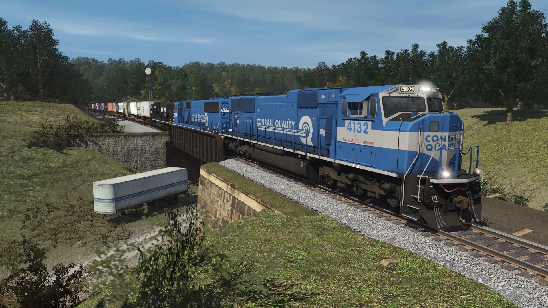 Tags: Trainz Railroad Simulator 2019, NS Horseshoe Curve Modified w CPC 4/15/2022, CR SD70MAC, NS SD60E, CR SD60M, Spinecar A Unit Dirty, Spinecar C Unit Dirty, Spinecar D Unit Dirty, Spinecar E Unit Dirty, Spinecar B Unit Dirty, TTX 89ft TOFC Flatcar, NS Caboose 555555, PRR Caboose NE-5 477375 fictional