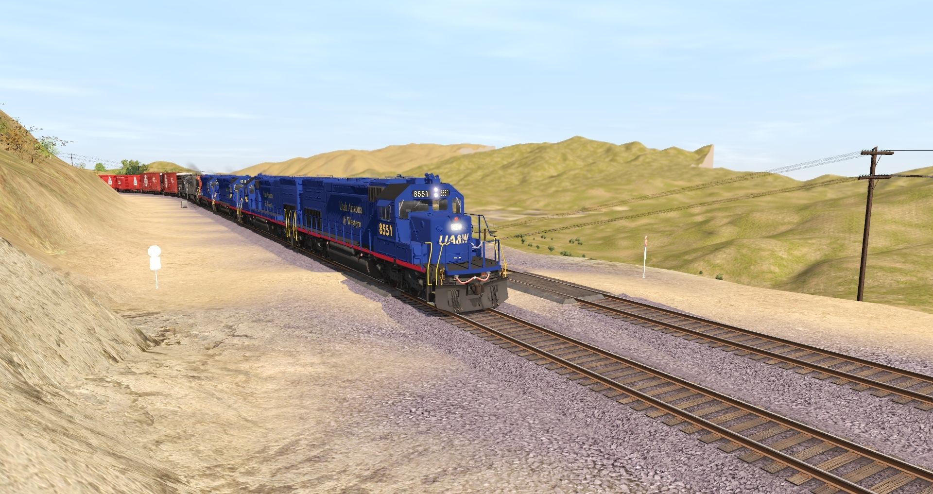 Tags: Trainz Railroad Simulator 2019, Mojave Sub Division, Default, UA&W SD40T-2, UA&W SD45, SP B30-7 W1, SP GP40-2, ATSF 50' PC&F 6033 Bx-127 (1970s), BAR 50' PS-1 2, BAR 50' PS-1, BN 2 Bay Hopper ACF 2971 ex-NP, BN 100 Ton Hopper, B&O 50' PS-1, Chessie (WM) 50' ACF Boxcar