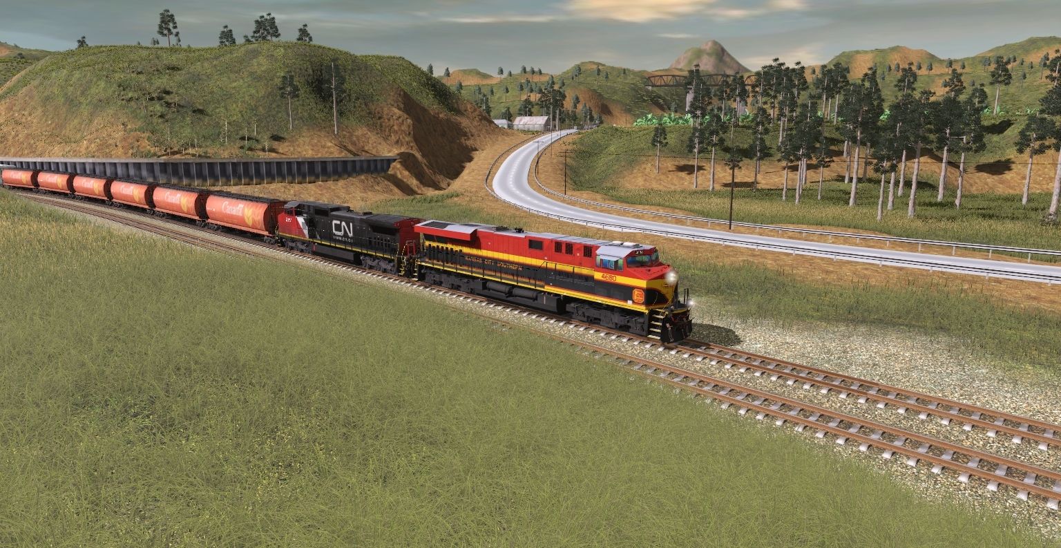 Tags: Trainz Railroad Simulator 2019, Kickstarter County 2, kcs grain train, KCS ES44AC Belle Scheme, CN C40-8W, CNWX Cylindrical Hopper, ACFX Covered Hopper