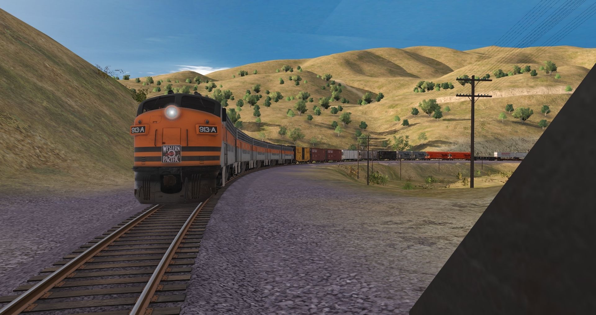 Tags: Trainz Railroad Simulator 2019, Mojave Sub Division, Default, WP F7A #913-A Freight/Black Pilot, WP F7B Freight, WP F7A #919-A Freight/Black Pilot, B&O 50' PS-1 Insulated (Weathered), CGW 50' PS-1 (Weathered), CGW 50' PS-1, CGW 3-Bay Covered Hopper, CRR 50' ACF Boxcar, DRGW 2 Bay Hopper ACF 2971, DRGW ACF Centerflow 4 Bay (1973), DT&I Greenville Gondola