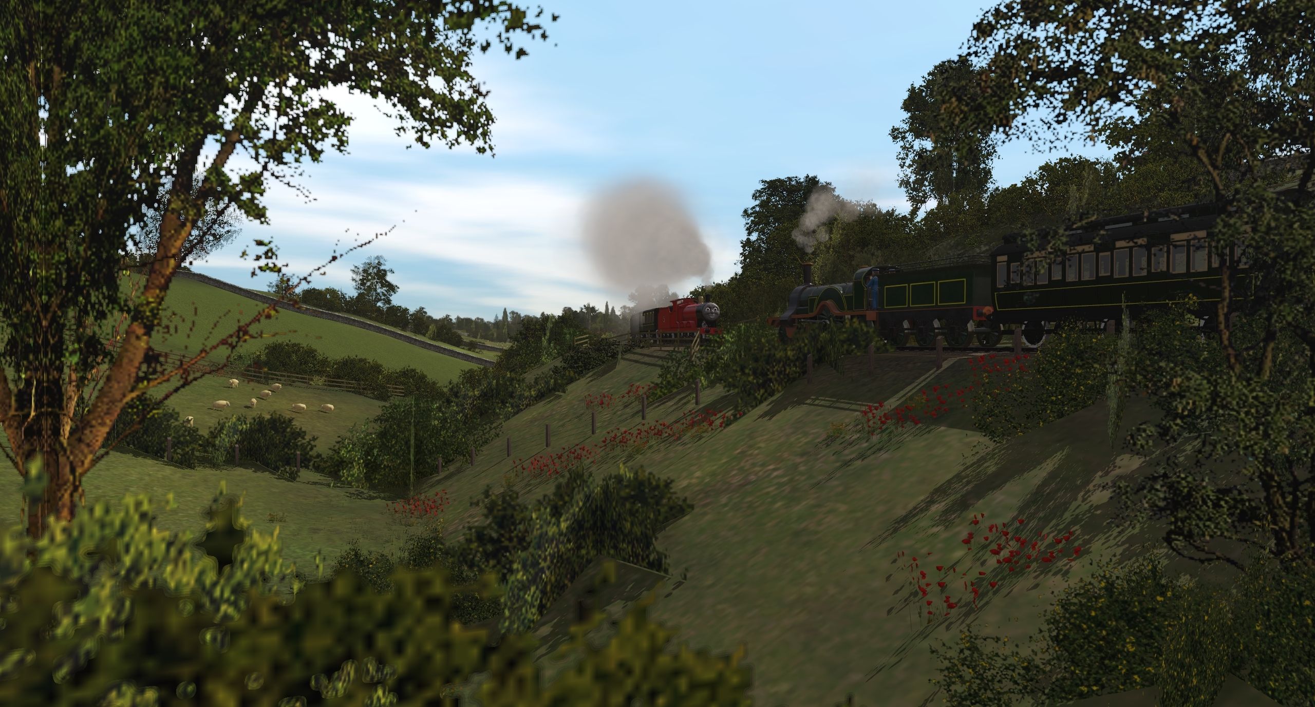 Tags: Trainz Railroad Simulator 2019, IoS - The Kellsthorpe Extension, TW3D - Emily the Emerald Engine, TTTE - James the red engine, Emily's Brake Coach 2020, Emily's Coach 2020, TW3D - Emily's Tender, TTTE - James's Tender, TTTE - Old Coach 1st Class Composite, TTTE - Old Coach 3rd Class Composite, TTTE - Old Coach Brake