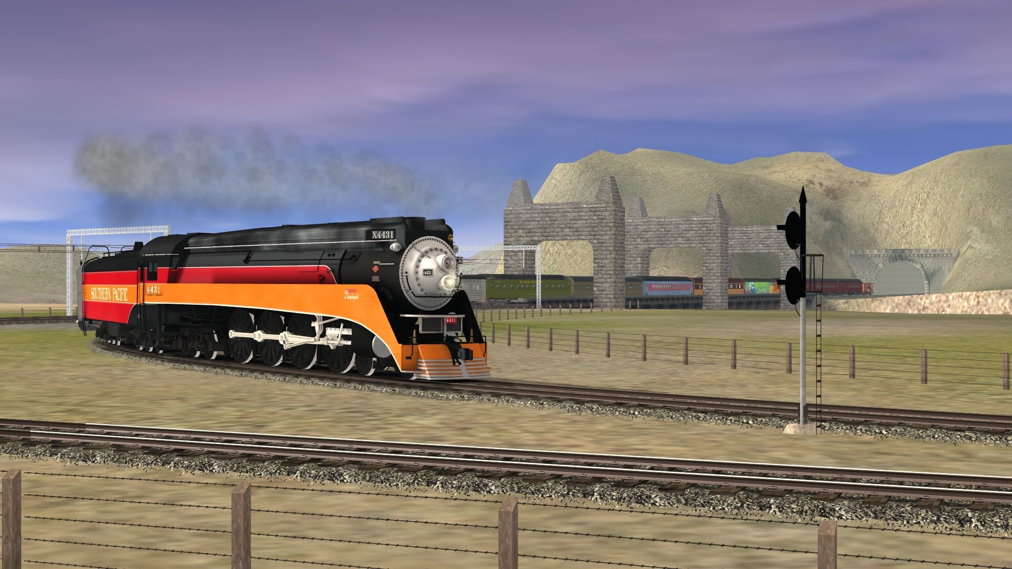 Tags: Trainz: A New Era, North America (combined routes), Default, SP GS-4 Engine Daylight, SP GS-4 Tender Daylight Postwar, Southern Streamlined Coach, Sleeper C&O George Washington, Pullman Paul A Bert, Polar Express Coach, IC Coach, DSFX South America, N&W Coach, N&W Combine, SP C50-9 Caboose
