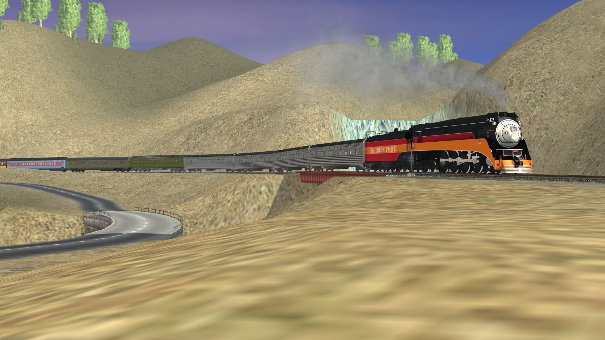 Tags: Trainz: A New Era, North America (combined routes), Default, CP Rail GP9 low hood #1550, SP GS-4 Engine Daylight, CP F7B, SP GS-4 Tender Daylight Postwar, Southern Streamlined Coach, CO-OP Bulk Hopper, Sleeper C&O George Washington, Pullman Paul A Bert, Polar Express Coach, IC Coach, DSFX South America