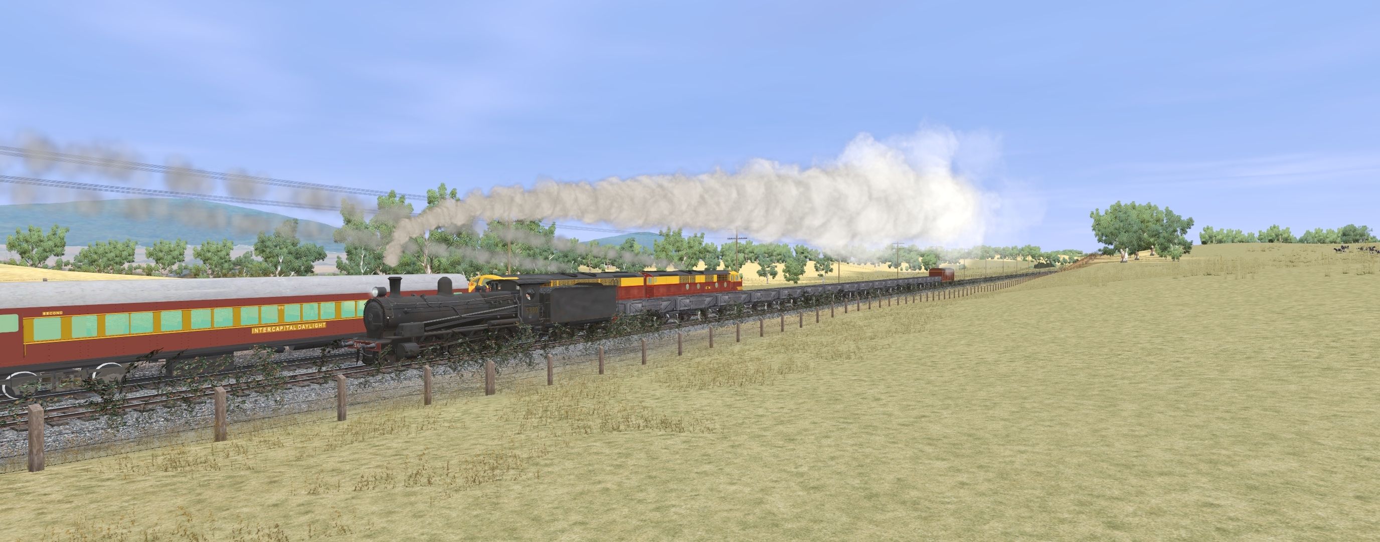 Tags: Trainz Railroad Simulator 2022, WeddinNSW: Blayney-Galong-Cootamundra, WeddinNSW: 1959 Lithgow Coal, NSWGR D53 standard goods engine weathered, NSWGR 42 class, NSWGR SFS Sitting Car RUB Set TR, NSWGR D53-class Wampu tender weathered, NSWGR SBS Sitting Car RUB Set TR, NSWGR RS Dining Car RUB Set TR, NSWGR S Truck Empty, MHG Brake Van, NSWGR PHS Power Car RUB Set TR