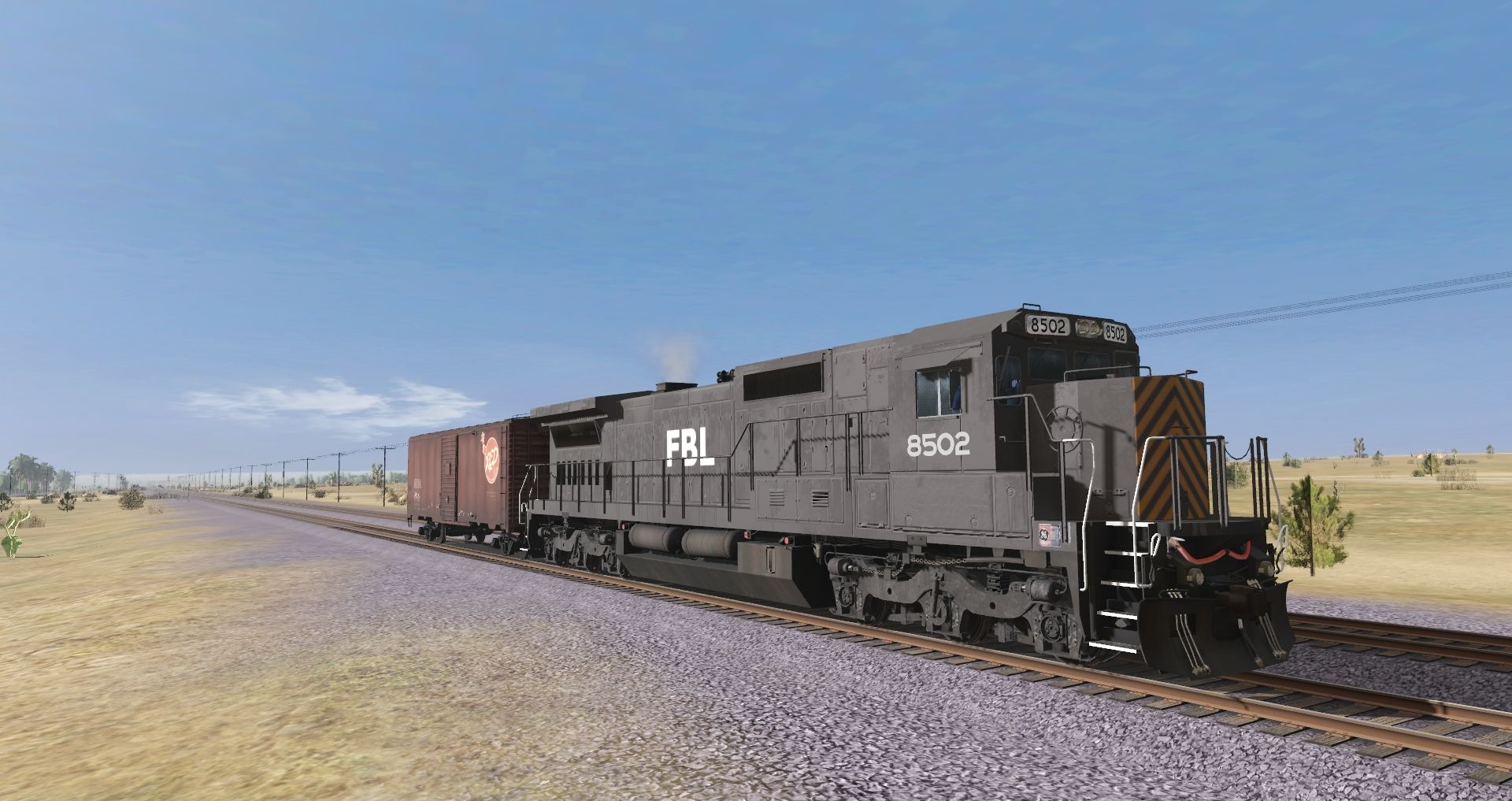 Posted by: ljdj | Posted:2022-06-20 20:07:32 Caption: Tags: Trainz Railroad Simulator 2019, Mojave Sub Division, Default, FBL C40-8, REDX 40Ft Boxcar