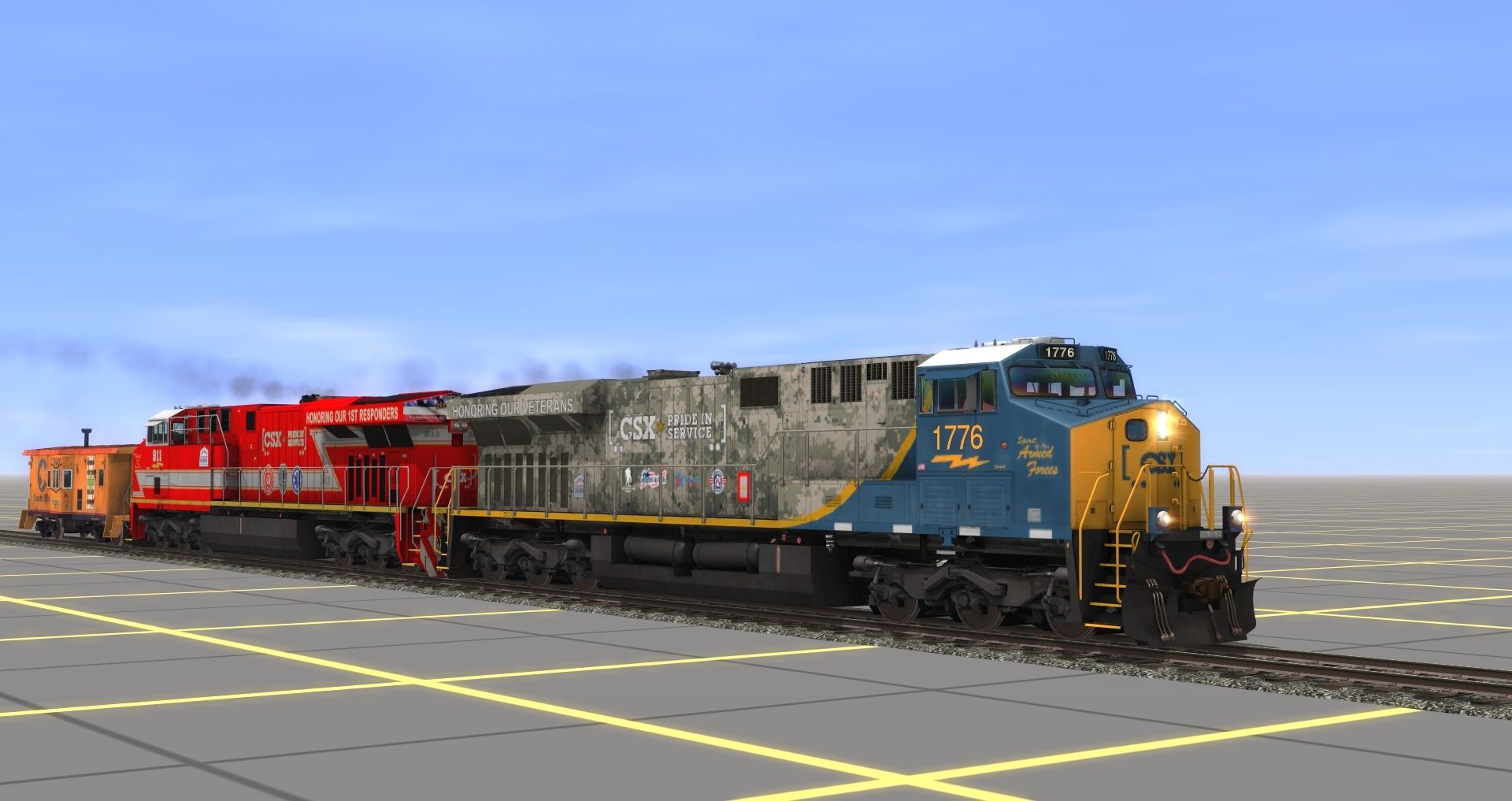 Tags: Trainz: A New Era, New Route, CSX ES44AH #1776 'Spirit of Our Armed Forces, CSX ES44AH #911 'Spirit of our First Responders, CSX ex-Chessie Bay Window Caboose