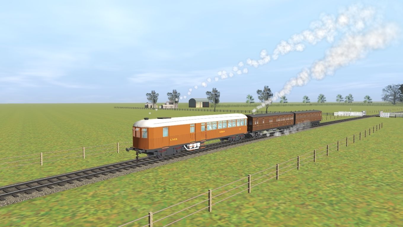 Tags: Trainz Railroad Simulator 2019, GER West Norfolk Railway, LNER Sentinel D96 B 29, GER Steam Railmotor (brown), GER Steam Railmotor Trailer V3 (brown), Holden S56 - BR Early Crest, BR Mk1 Sub. C Carmine, BR Mk1 Sub. BS Carmine