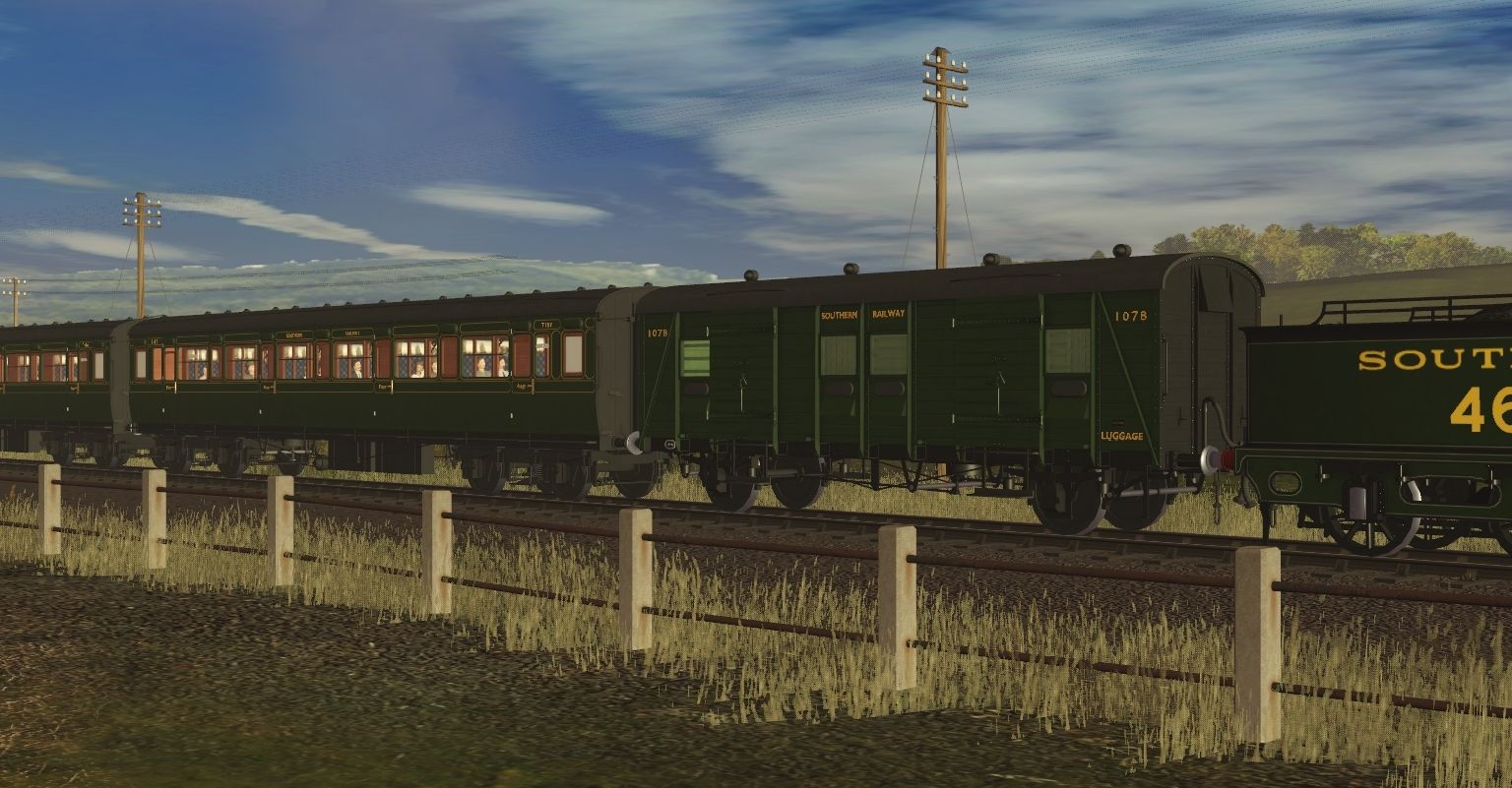 Tags: Trainz Railroad Simulator 2019, Dearnby & District : UK 1900's-1910's Mainline Branchline & Narrow Gauge V2.0, SR Drummond D15 - Olive Green, SR Drummond 6 Wheel Tender (Wide Cab) - Olive Green, SR Maunsell PLV - Passenger Luggage Van - Olive Green, SR (ex-LSWR) 56 ft Corridor First FK - Olive, SR (ex-LSWR) 56 ft Corridor Third TK - Olive, SR (ex-LSWR)) 56 ft Corridor Brake Third BTK (LH) - Olive