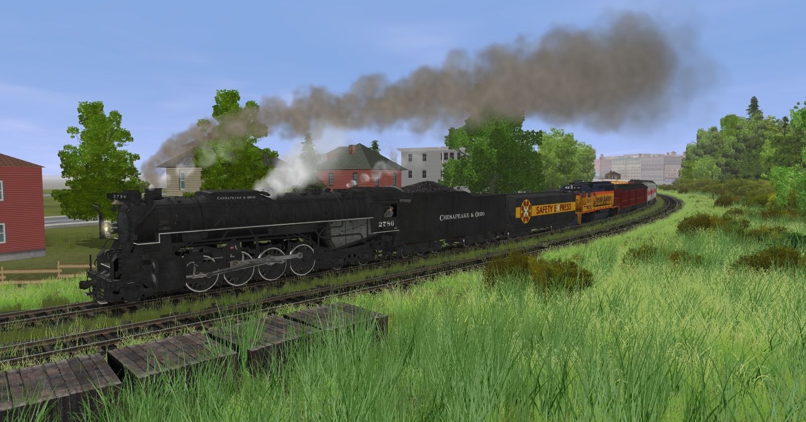 Tags: Trainz: A New Era, Lake of Steel Route Headquarters, C&O Kanawha (TP&P 2786 1980's), Chessie GP40-2 (B&O ph1), EMD E8 B&O #1445, C&O Kanawha Tender (TP&P 2786 1980's), Chessie Safety Express Aux Tender S2, ACE 3000 614T Tool Car, DB&EV 01 Power Car, ACE 3000 614T Coach, R&N Pullman Sleeper Red Faded, R&N Pullman Parlor Red, Chessie Safety Express 04 Coach Roundtop