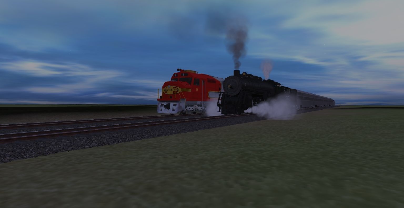Tags: Trainz Railroad Simulator 2019, Crawford Hill, ATSF 3700 Class Engine #3747, SF-FP45-001, ATSF 3700 Class Tender #3747, ATSF SS 6-4-4 Sleeper Valley Series (Two Tone), ATSF SS Chair Car, ATSF Observation