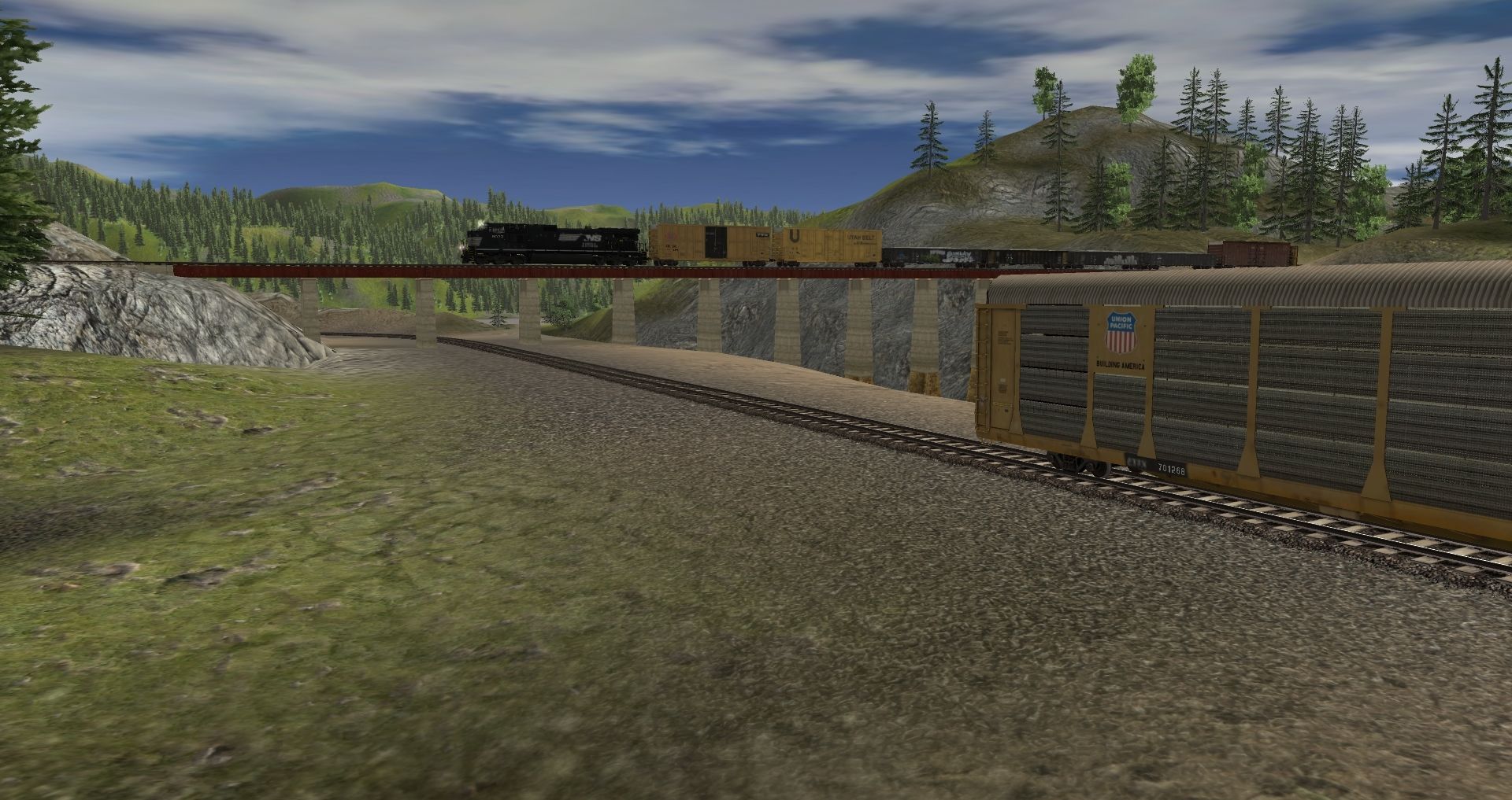 Tags: Trainz: A New Era, Kickstarter County, NS Horsehead C40-9W, UP SD70M Flag, 89Ft Autorack UP 3, 89Ft Autorack UP 2, 89Ft Autorack UP, 89Ft Autorack SP, 89Ft Autorack NS 2, 50ft Boxcar TTX, 50ft Boxcar UB Weathered, 89Ft Autorack NS, 52ft Gondola CEFX 2