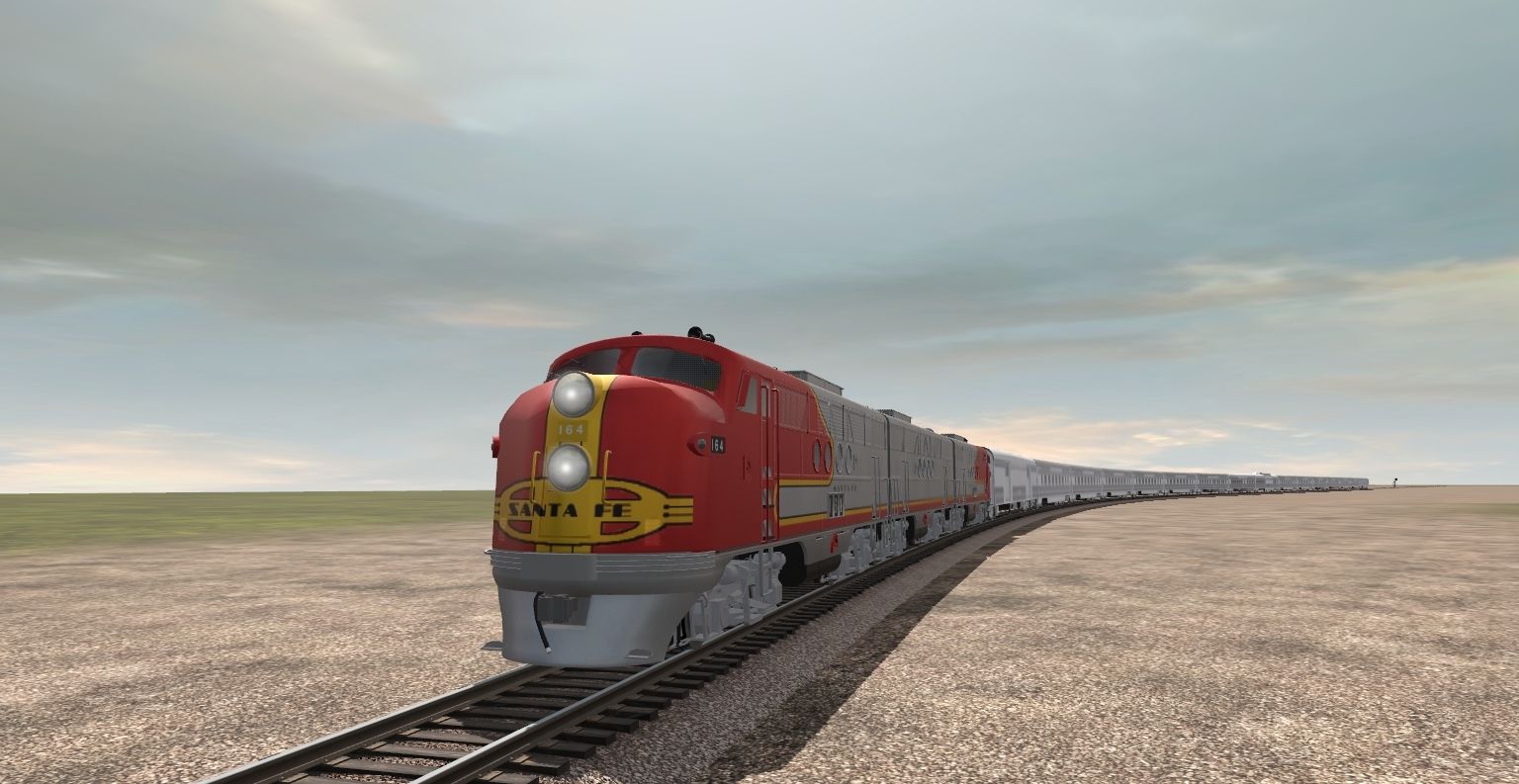 Tags: Trainz Railroad Simulator 2019, Consist - Test Route (TRS19/22 & PBR), Default, ATSF FT A pass, ATSF FT B pass, ATSF SS Baggage Car, ATSF SS Chair Car, ATSF SS Diner, ATSF SS Pleasure Dome, ATSF SS Pullman - Pine series, ATSF SS Obs Navajo