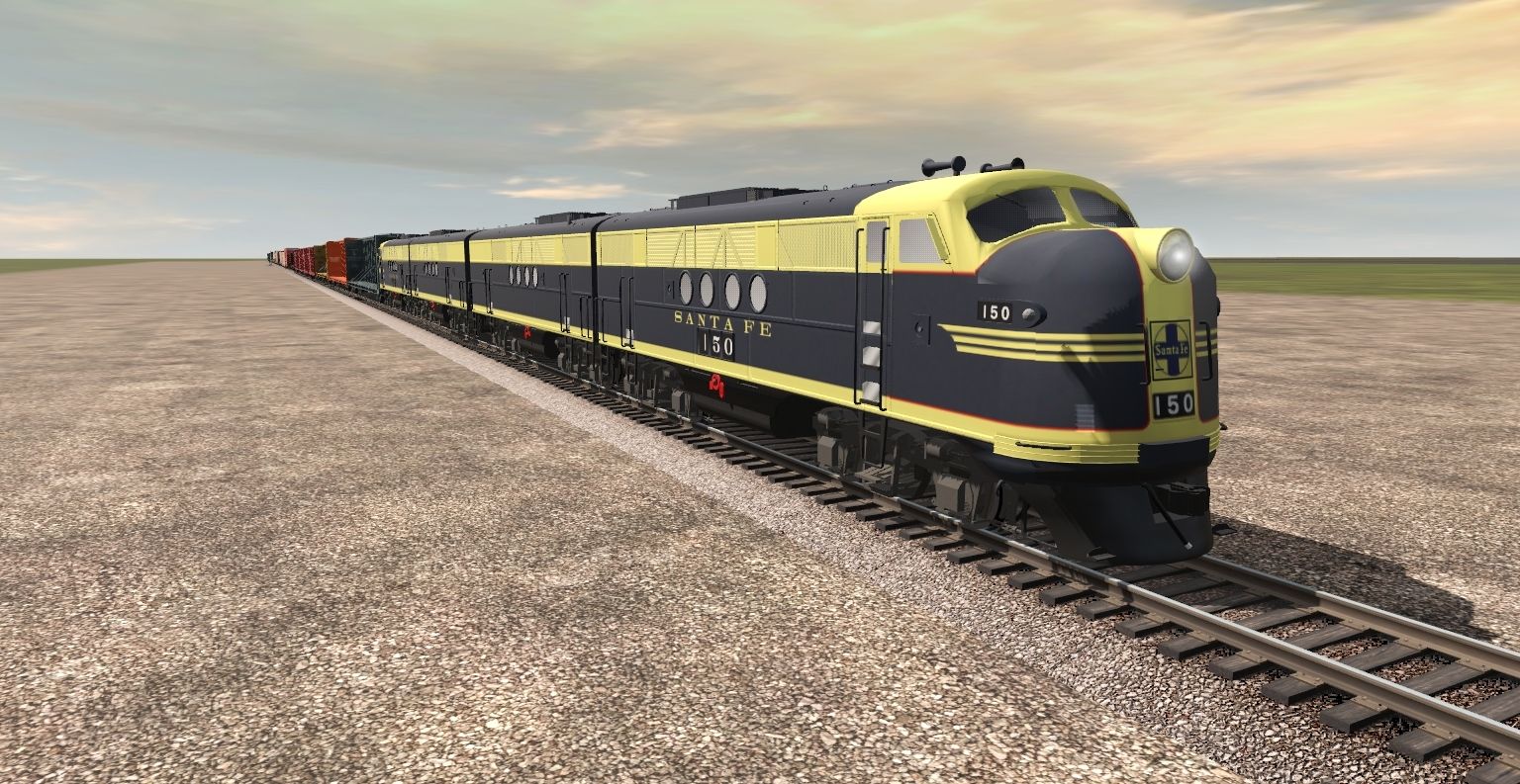 Tags: Trainz Railroad Simulator 2019, Consist - Test Route (TRS19/22 & PBR), Default, ATSF FT B, ATSF FT A, TRP 73ft Centerbeam CAGY, 73ft Centerbeam PRR #469901, 73ft Centerbeam TTZX, SRN 50ft Boxcar FMC, CP Teoli Gondola Black, H43 3Bay Hopper Santa Fe MFX#, H43 3Bay Hopper Santa Fe ns MFX#, 50ft High Cube Boxcar CRLE, 50ft Boxcar ATSF #501523