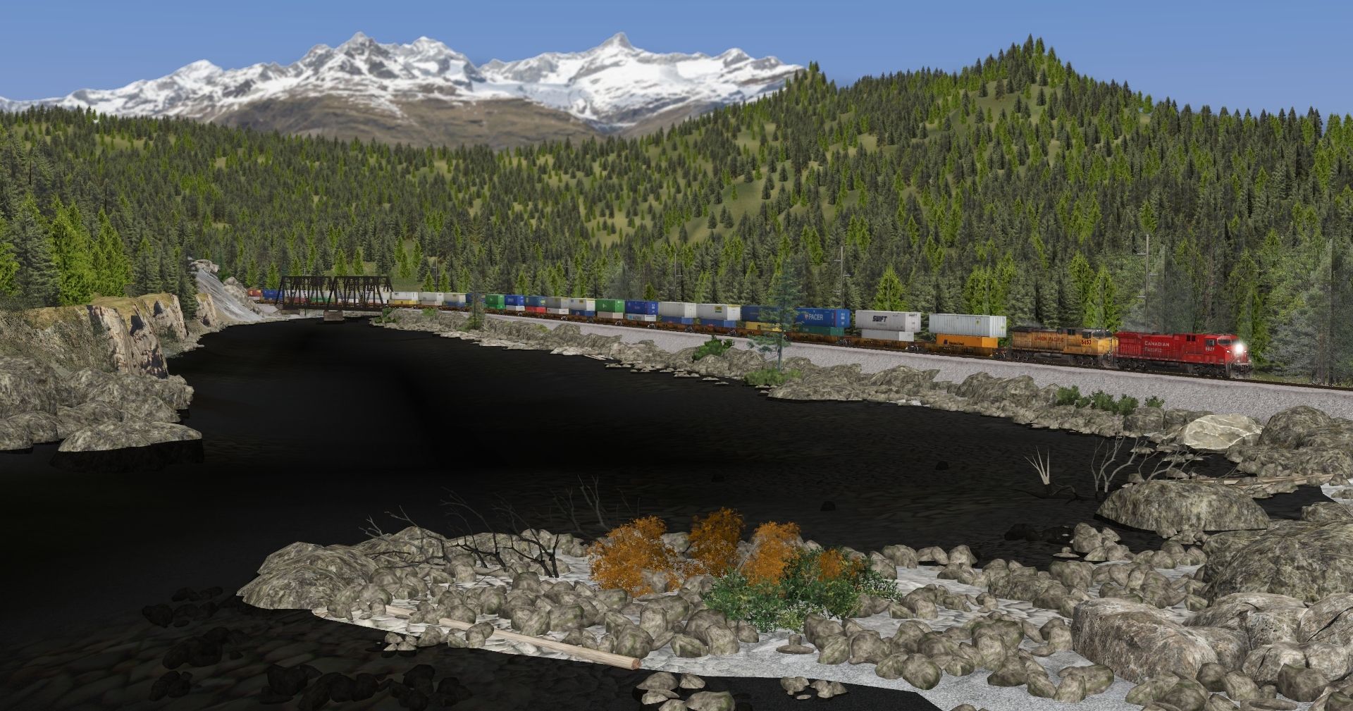 Tags: Trainz Railroad Simulator 2022, BN Oasis, Default, CP AC4400CW 9800-9840 Repaint TS19 1, UP AC4400CW 6430-6549 TS19 4, CP ES44AC (early), TTX weathered 53 Husky Stack