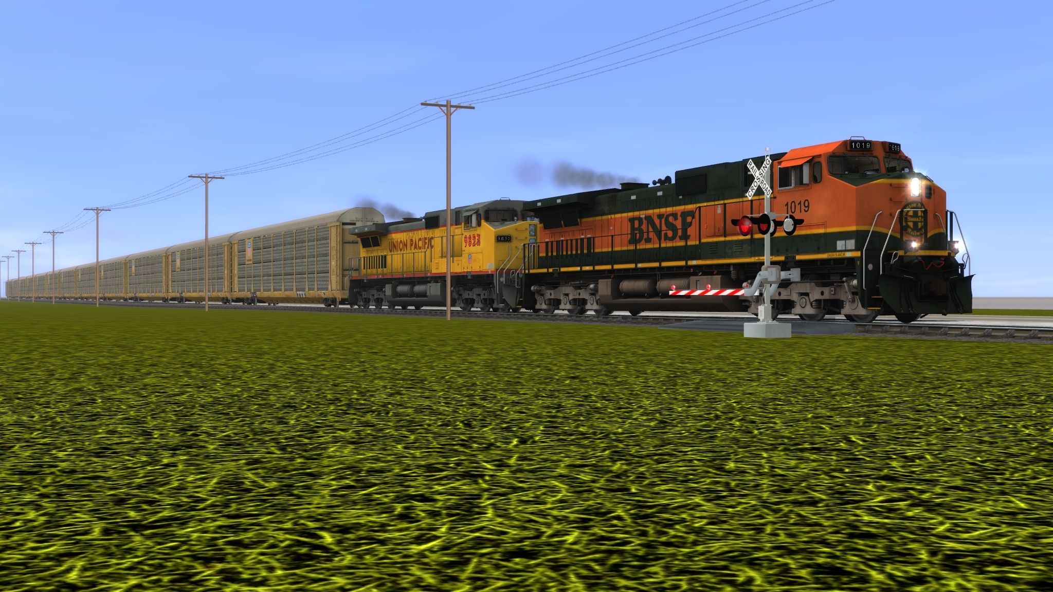 Posted by: torontoaviator | Posted:2022-07-02 21:10:40 Caption: Tags: Trainz: A New Era, switching 1, Default, BNSF H1 Dash 9-44CW, UP Dash 9-44CW, 89Ft Autorack UP 3