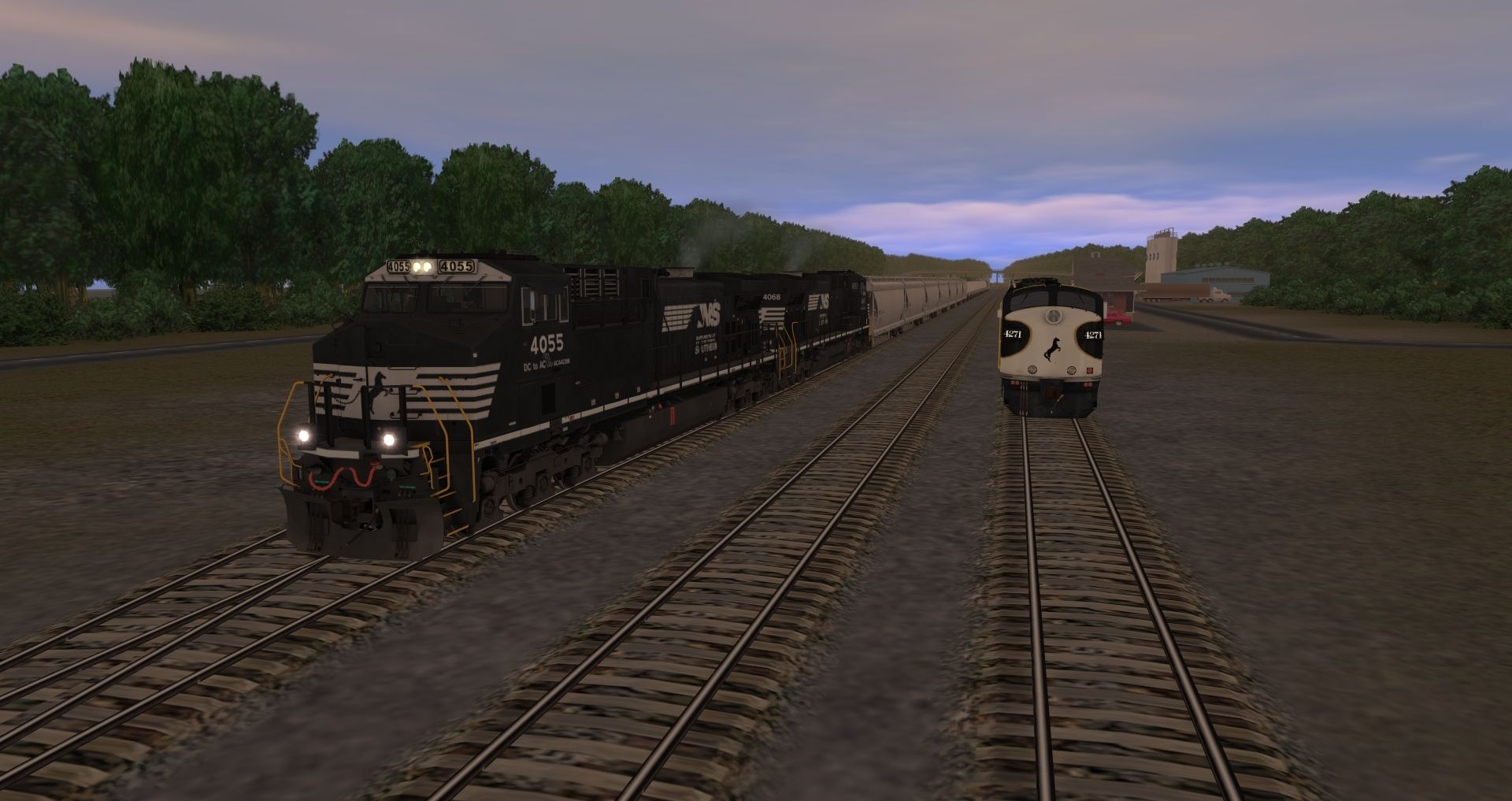 Tags: Trainz: A New Era, NS Lake Division District, NS AC44C6M, NS F9A 4271, NS F7B 4275, NS F7B 4276, NS F9A 4270, JRPX ACF Centerflow 4 Bay round hatch, NS HEP Power Car Tennessee, NS Coach Car New Jersey, N&W MRLX 1490 Sleeper 'Ohio State University, NS Coach Car Iowa, JRPX 20800 gal tank car