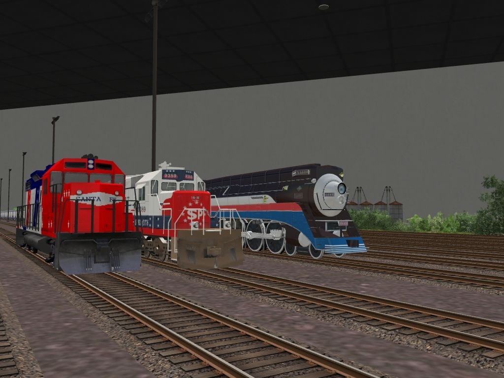 Tags: Trainz: A New Era, Brazemore Yard, ATSF Bicentenial loco, EMD SD40T-2 SSW Bicentennial #9389, American Freedom:Class GS-4 Steam Engine, American Freedom:Class GS-4 Tender, American Freedom:Car #040, American Freedom:Car #041, American Freedom:Car #100, American Freedom:Car #101, American Freedom:Car #104, American Freedom:Car #107, American Freedom:Car #108