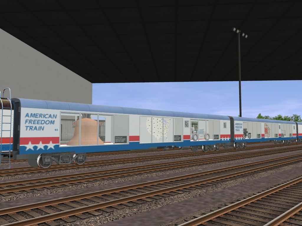 Tags: Trainz: A New Era, Brazemore Yard, American Freedom:Class GS-4 Steam Engine, EMD SD40T-2 SSW Bicentennial #9389, ATSF Bicentenial loco, American Freedom:Class GS-4 Tender, American Freedom:Car #040, American Freedom:Car #041, American Freedom:Car #100, American Freedom:Car #101, American Freedom:Car #104, American Freedom:Car #107, American Freedom:Car #108