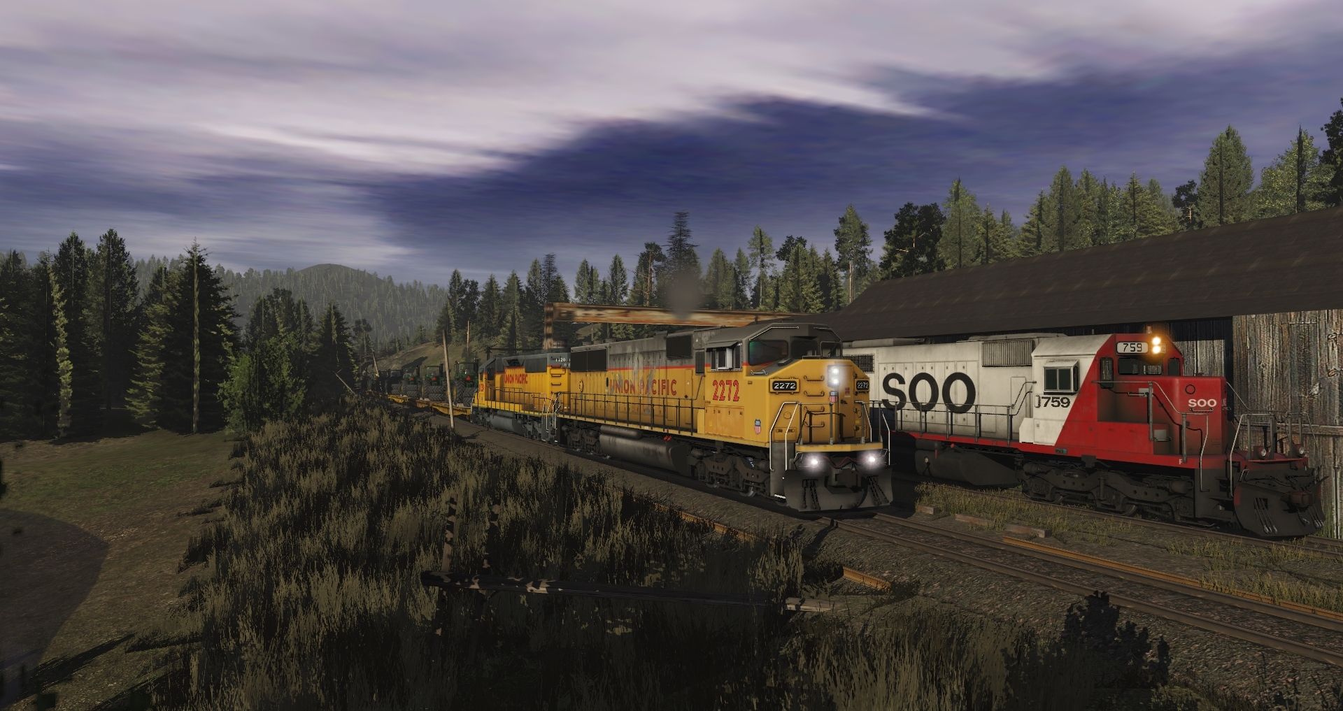 Tags: Trainz Railroad Simulator 2019, Eagle River Railway, 01 Monday - 14:57 21/05/2022 - 00:19:01, SOO SD40-2 Late V1, UP SD60M(Triclops), UP SD40N 1500-1899 [PTC] WING, RBOX2 50ft Boxcar FMC, RBOX 50ft Boxcar FMC, RBOX P-S 50_6ft Boxcar, UP GSC 60ft flatcar F-70-15