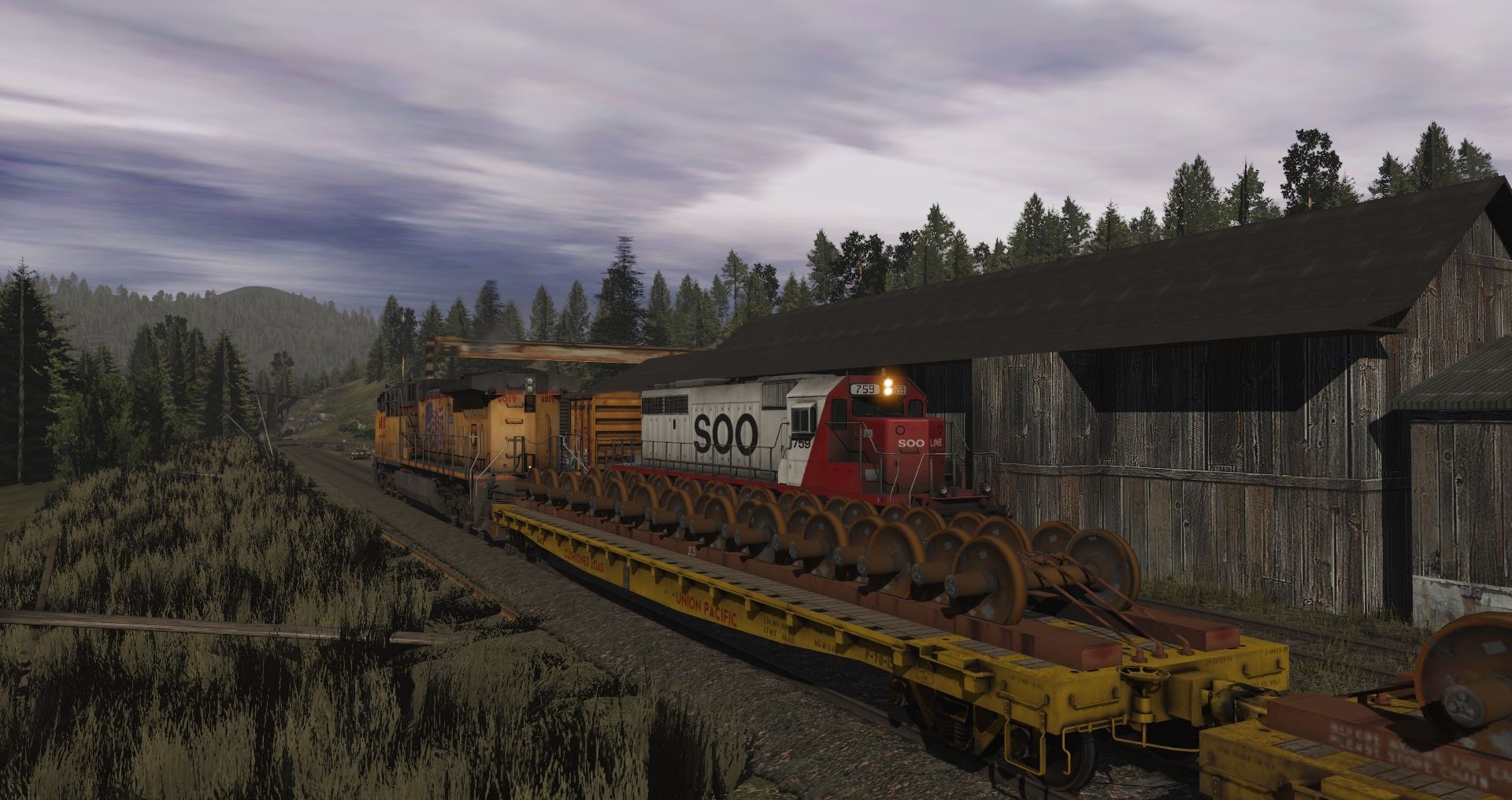 Tags: Trainz Railroad Simulator 2019, Eagle River Railway, 01 Monday - 14:57 21/05/2022 - 00:19:01, SOO SD40-2 Late V1, UP AC4400CW 5982-6081 TS19 4, UP AC4400CW EX-SP 6148-6420 TS19, RBOX2 50ft Boxcar FMC, RBOX 50ft Boxcar FMC, RBOX P-S 50_6ft Boxcar, UP GSC 60ft flatcar F-70-15